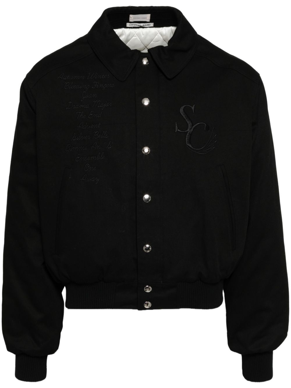 souvenir bomber jacket Highlights - Black - Cotton - Twill weave - Front press-stud fastening - Embroidered slogan to the front - Classic collar - Long sleeves - Two side slit pockets - Ribbed cuffs and hem Made in United Kingdom Composition Lining: Polyester 50%, Viscose 50% Outer: Cotton 100% SIZE & FIT Model measurements Height 6 ft 2 in(1.87 m) Bust/Chest 33.07 in(84 cm) Hips 35.43 in(90 cm) Waist 26.77 in(68 cm) FittingInformation Designed to be unstructured, offering a loose fit throughout The ribbed hem offers a close, comfortable fit Made from a padded non-stretch fabric, giving it no natural elasticity