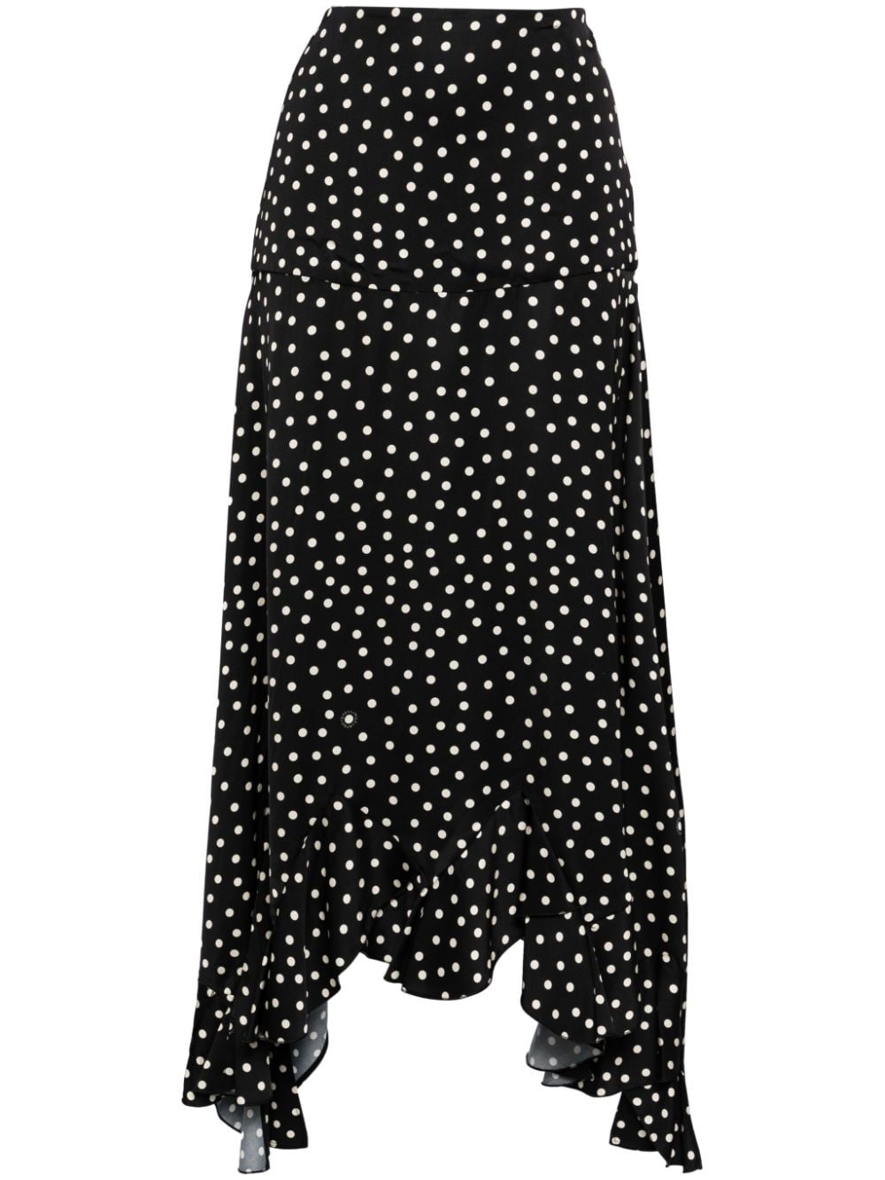 asymmetric polka-dot maxi skirt Highlights - Black/white - Polka dot print - Asymmetric design - Mid-rise - A-line - Tiered skirt - Ankle-length - Asymmetric ruffle hem Imported Composition Viscose 100% SIZE & FIT Measurement HIPS 37.79 in(96 cm) LENGTH 33.46 in(85 cm) WAIST 28.34 in(72 cm)