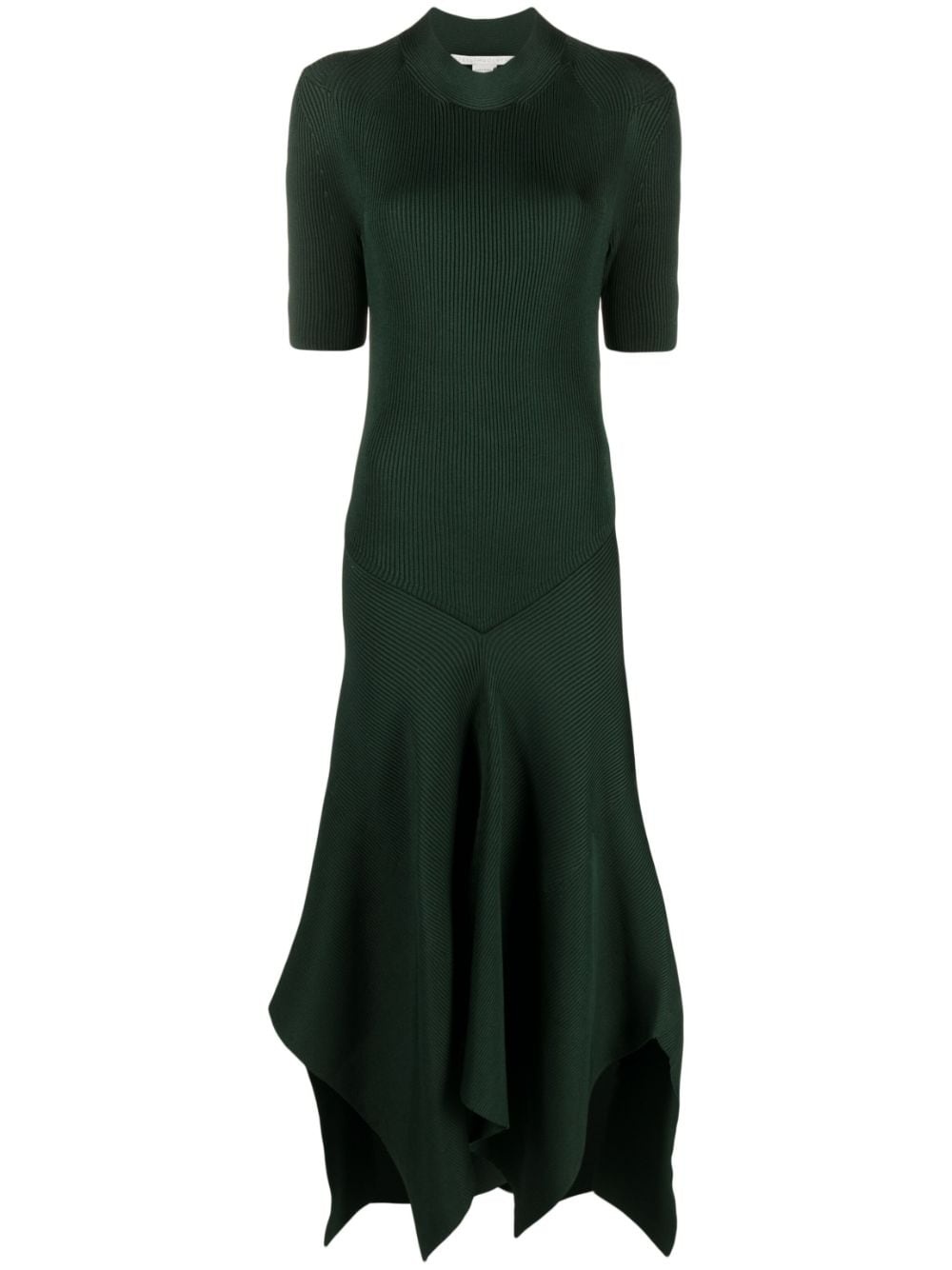 asymmetric ribbed-knit dress Stella McCartney lends the knitted dress a contemporary appeal by updating it with an asymmetric hem. The flared design elevates the sleek green-hued piece. Highlights - Forest green - Ribbed knit - Mock neck - Short sleeves - Asymmetric hem - Ankle-length Imported Composition Viscose 79%, Polyamide 19%, Spandex/Elastane 2% SIZE & FIT Model measurements Height 5 ft 10 in(1.79 m) Bust/Chest 31.49 in(80 cm) Hips 35.03 in(89 cm) Waist 23.62 in(60 cm) FittingInformation Designed for a close fit throughout Made with a midweight knit, this piece offers some stretch This piece fits true to size – take your usual size Measurement SLEEVE LENGTH 10.98 in(27.9 cm) HIPS 34.01 in(86.4 cm) LENGTH 47.99 in(121.9 cm) WAIST 25.98 in(66 cm) BUST 25.98 in(66 cm) Washing instructions Hand Wash