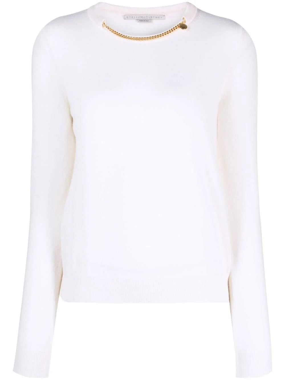 chain-embellished wool jumper First seen on Stella McCartney's iconic Falabella bags, diamond-cut chains have become one of the label's most recognisable motifs. A scaled-down version adorns the neckline of this white jumper, which is crafted from wool and enriched with a logo medallion charm. Highlights - Off-white - Wool - Knitted construction - Chain-link detailing - Gold-tone hardware - Crew neck - Long sleeves - Ribbed trim - Straight hem Made in Italy Composition Wool 100% SIZE & FIT Model measurements Height 5 ft 11 in(1.8 m) Bust/Chest 34.25 in(87 cm) Hips 35.82 in(91 cm) Waist 24.8 in(63 cm) Washing instructions Hand Wash