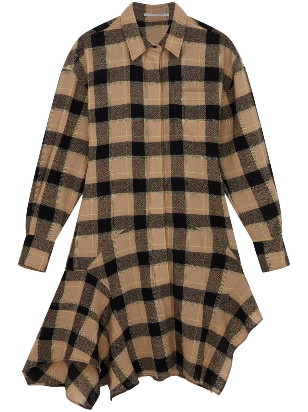 check-pattern wool shirt dress Highlights - Camel brown/black - Wool - Check pattern - Spread collar - Concealed front button fastening - Drop shoulder - Long sleeves - Buttoned cuffs - Chest patch pocket - Asymmetric hem Made in Italy Composition Wool 100% Washing instructions Read Manufacturer Guidelines