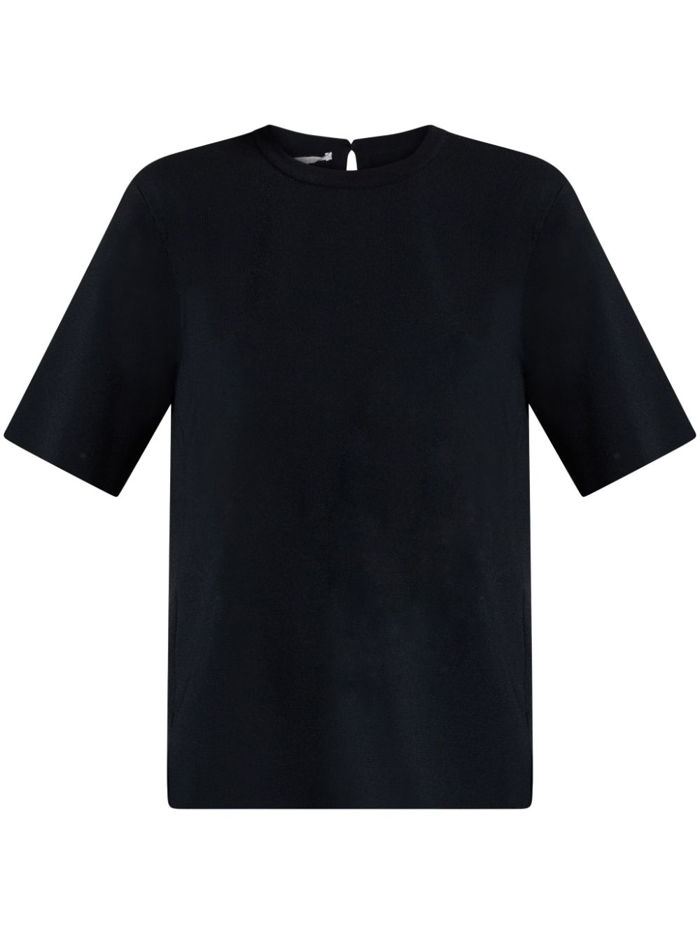 compact-knit T-shirt Highlights - Black - Round neck - Rear button fastening - Short sleeves - Straight hem Made in Italy Composition Viscose 83%, Polyester 17%