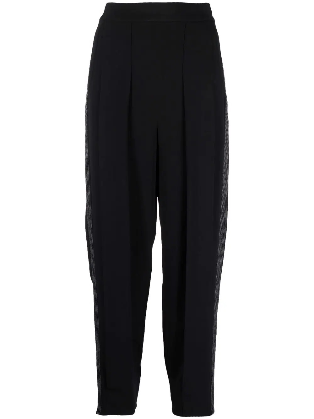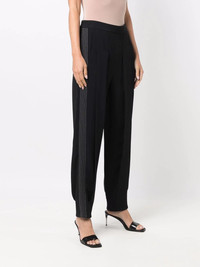 contrast-stitch trousers Stella McCartney's trousers are a masterclass in smart-casual dressing. Slightly tapered at the cuffs to define the slouchy silhouette, this black pair is accented with contrast stitching along the sides. Highlights - Black - Pleat detailing - Contrast stitching - Elasticated waistband - Two side slash pockets - Tapered leg - Tapered leg Imported Composition Viscose 64%, Acetate 32%, Elastane 4% SIZE & FIT Model measurements Height 5 ft 9 in(1.74 m) Bust/Chest 32.28 in(82 cm) Hips 35.82 in(91 cm) Waist 24.01 in(61 cm) FittingInformation This piece fits true to size. We recommend you get your regular size Designed to be fitted at the waist, loose over the leg Made with a mid-weight non-stretch fabric Washing instructions Dry Clean Only