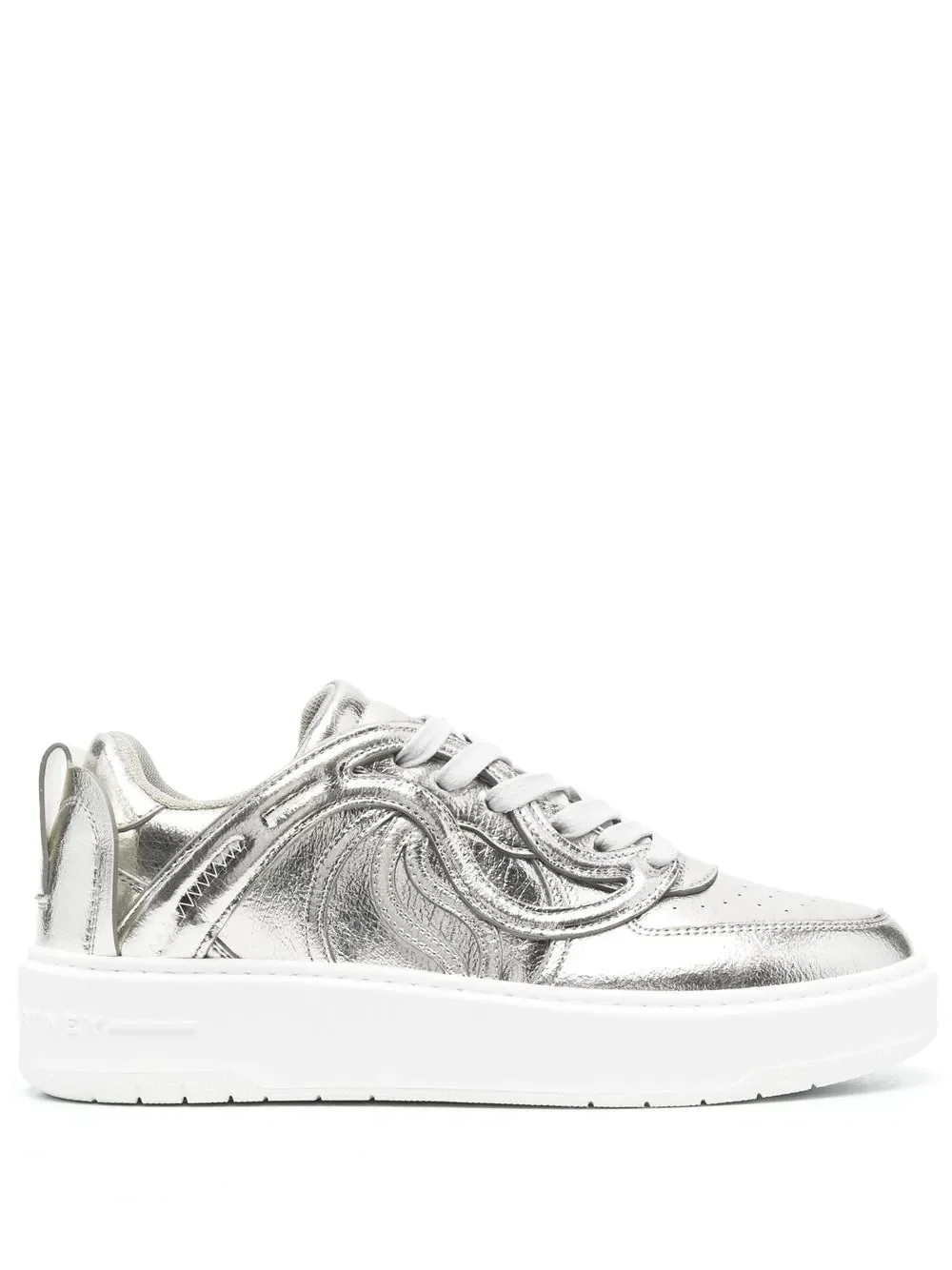 Cupsole low-top sneakers Stella McCartney's Cupsole sneakers are defined by the intricate cut-out detailing decorating the side. The brand's QR code earth graphic is printed onto the tongue. Highlights - Silver - Faux leather - Metallic finish - Cut-out detailing - Logo pull-tab at the heel - Logo-print tongue - Perforated detailing - Padded ankle - Front lace-up fastening - Platform sole Made in Italy Composition Other fibres 100% SIZE & FIT Measurement HEEL 1.37 in(3.5 cm) Sole height 1.18 in(3 cm)