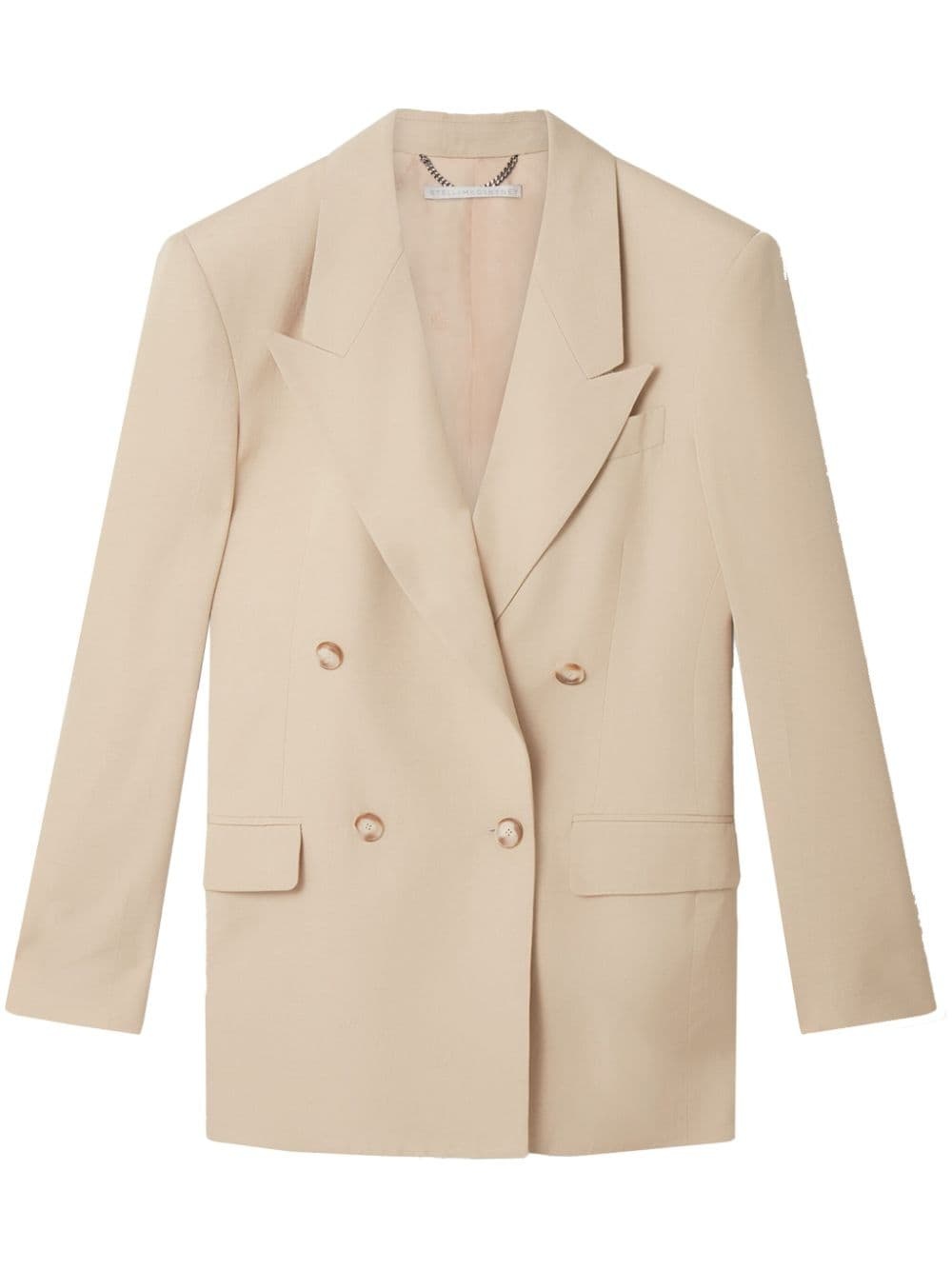 double-breasted blazer Imagined in beige with complementary tortoiseshell buttons, this classic double-breasted blazer by Stella McCartney is detailed with peak lapels, two front flap pockets and an American rear vent. Highlights - Beige - Peak lapels - Double-breasted button fastening - Long sleeves - Buttoned cuffs - Two front flap pockets - American rear vent - Straight hem Made in Italy Composition Lining: Viscose 100% Outer: Viscose 100% Trims: Viscose 60%, Cupro 40% SIZE & FIT Measurement SLEEVE LENGTH 18.89 in(48 cm) LENGTH 30.7 in(78 cm) WAIST 26.37 in(67 cm) BUST 35.43 in(90 cm) FittingInformation Designed for a relaxed fit, this piece allows for comfort and movement when worn The internal shoulder pads offer a structured shape Made from a midweight non-stretch fabric This piece fits true to size – take your usual size Washing instructions Read Manufacturer Guidelines