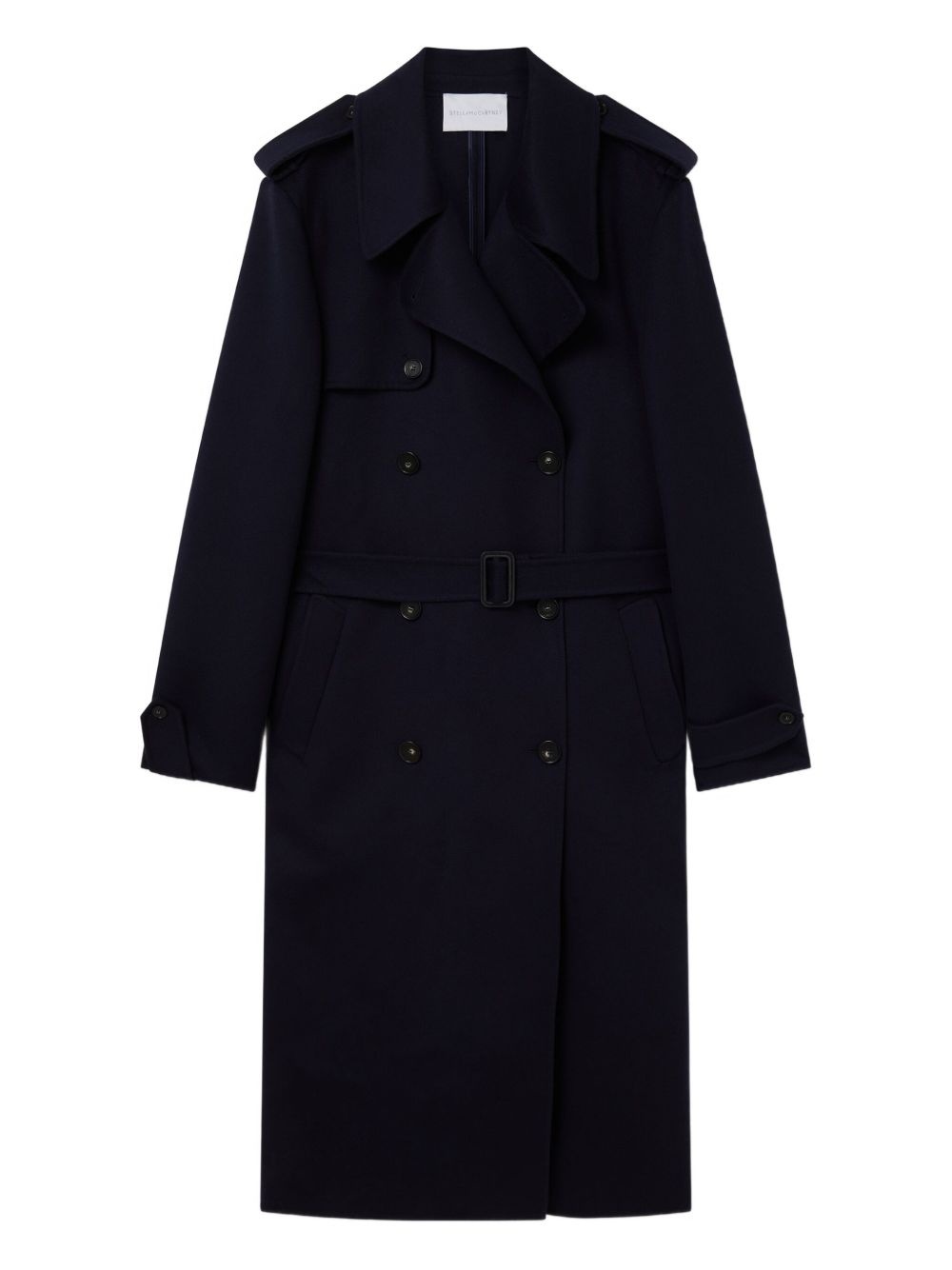 double-breasted trench coat Highlights - Navy - Belted waist - Button fastening - Classic lapel - Buttoned shoulder epaulettes - Side pockets Made in Italy Composition Wool 100% Washing instructions Read Manufacturer Guidelines