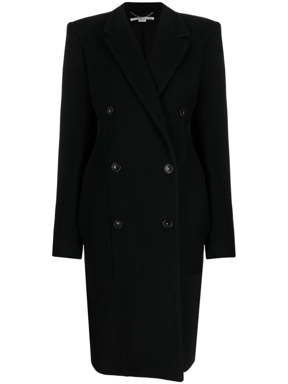 double-breasted wool coat This black coat speaks to Stella McCartney's refined style. It's cut from wool to a classic double-breasted silhouette. Highlights - Black - Wool - Notched collar - Double-breasted button fastening - Shoulder pads - Long sleeves - Full lining - Straight hem Made in Italy Composition Outer: Wool 100% Lining: Viscose 52%, Cotton 48% SIZE & FIT Model measurements Height 5 ft 10 in(1.77 m) Bust/Chest 32.67 in(83 cm) Hips 35.43 in(90 cm) Waist 23.62 in(60 cm) Measurement SLEEVE LENGTH 25.98 in(66 cm) LENGTH 42.51 in(108 cm) FittingInformation Designed for a slim fit that sits just away from the body offering a close yet comfortable fit The vented hem offers movement at the rear Made from a midweight non-stretch fabric This piece fits true to size – take your usual size Washing instructions Dry Clean Only