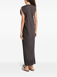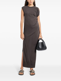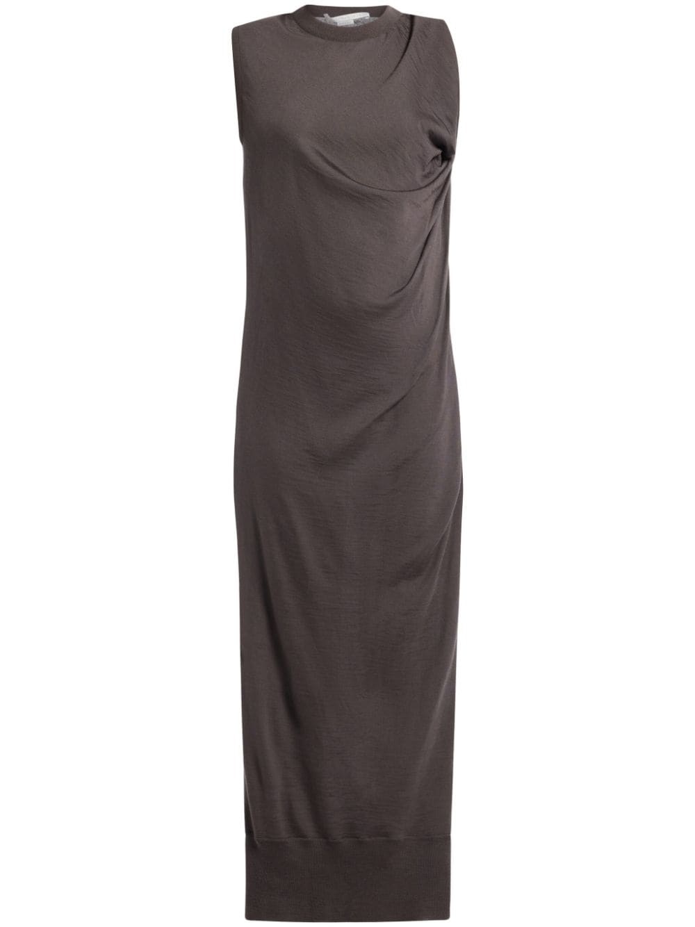 draped dress Highlights - Barley brown - Virgin wool blend - Knitted construction - Draped detailing - Side slit - Ribbed band collar - Crew neck - Sleeveless - Ankle-length - Straight hem Made in Italy Composition Virgin Wool 80%, Polyamide 17%, Spandex/Elastane 3% SIZE & FIT Measurement HIPS 39.37 in(100 cm) LENGTH 51.57 in(131 cm) WAIST 35.43 in(90 cm) BUST 32.28 in(82 cm)