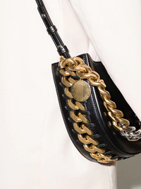 Frayme faux-leather shoulder bag Taking brand codes from the iconic Falabella, Stella McCartney's Frayme bag is a new take of the brand's visual narrative. Crafted from faux leather, this piece is decorated with mixed-tone chains and an exaggerated version of the brand's signature medallion. Highlights - Black - Faux-leather - Logo charm - Chain-link detailing - Open top - Chain-link shoulder strap - Main compartment Made in Italy Composition Polyester 51%, Polyurethane 49% SIZE & FIT Model measurements Height 5 ft 10 in(1.78 m) Bust/Chest 33.07 in(84 cm) Hips 35.03 in(89 cm) Waist 25.19 in(64 cm) Measurement DEPTH 2.75 in(7 cm) HANDLE 8.66 in(22 cm) HEIGHT 6.88 in(17.5 cm) STRAP 22.63 in(57.5 cm) WIDTH 8.46 in(21.5 cm)