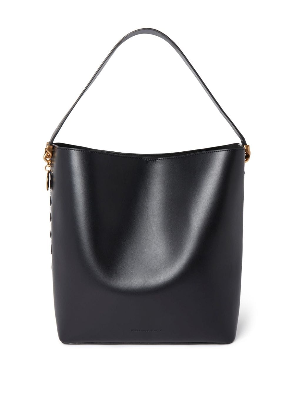 Frayme faux-leather tote bag Highlights - Black - Faux leather - Smooth grain - Lace-up detailing - Logo charm - Gold-tone hardware - Single top handle - Hook fastening - Main compartment - Internal slip pocket - Faux-leather lining Made in Italy Composition Lining: Polyurethane 50%, Polyamide 50% Outer: Organic Cotton 100%, Polyester 51%, Polyurethane 49% SIZE & FIT Measurement DEPTH 6.49 in(16.5 cm) HANDLE 8.85 in(22.5 cm) HEIGHT 12.59 in(32 cm) WIDTH 11.81 in(30 cm) STRAP 12.79 in(32.5 cm)