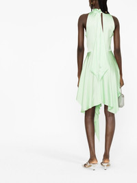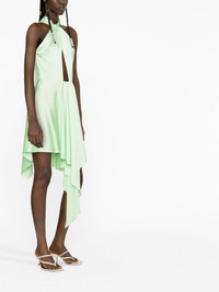 asymmetric halterneck dress Asymmetric detailing elevates this Stella McCartney minidress, which is crafted with a knotted neckline, a front cut-out and a handkerchief skirt. Its draped quality is complemented by the fluid fabric: it's made from FSC-certified forest-friendly viscose seersucker with a subtle sheen. Highlights - Mint green - Draped design - Cut-out detailing - Rear tie fastening - Halterneck tie fastening - Sleeveless - Asymmetric hem Imported Composition Viscose 98%, Spandex/Elastane 2% SIZE & FIT Model measurements Height 5 ft 10 in(1.79 m) Bust/Chest 31.1 in(79 cm) Hips 35.03 in(89 cm) Waist 24.01 in(61 cm) FittingInformation Designed for a close fit at the chest and waist with a loose fit at the hip Made from a midweight stretch fabric, this piece offers elasticity and flexibility when worn This piece fits true to size – take your usual size