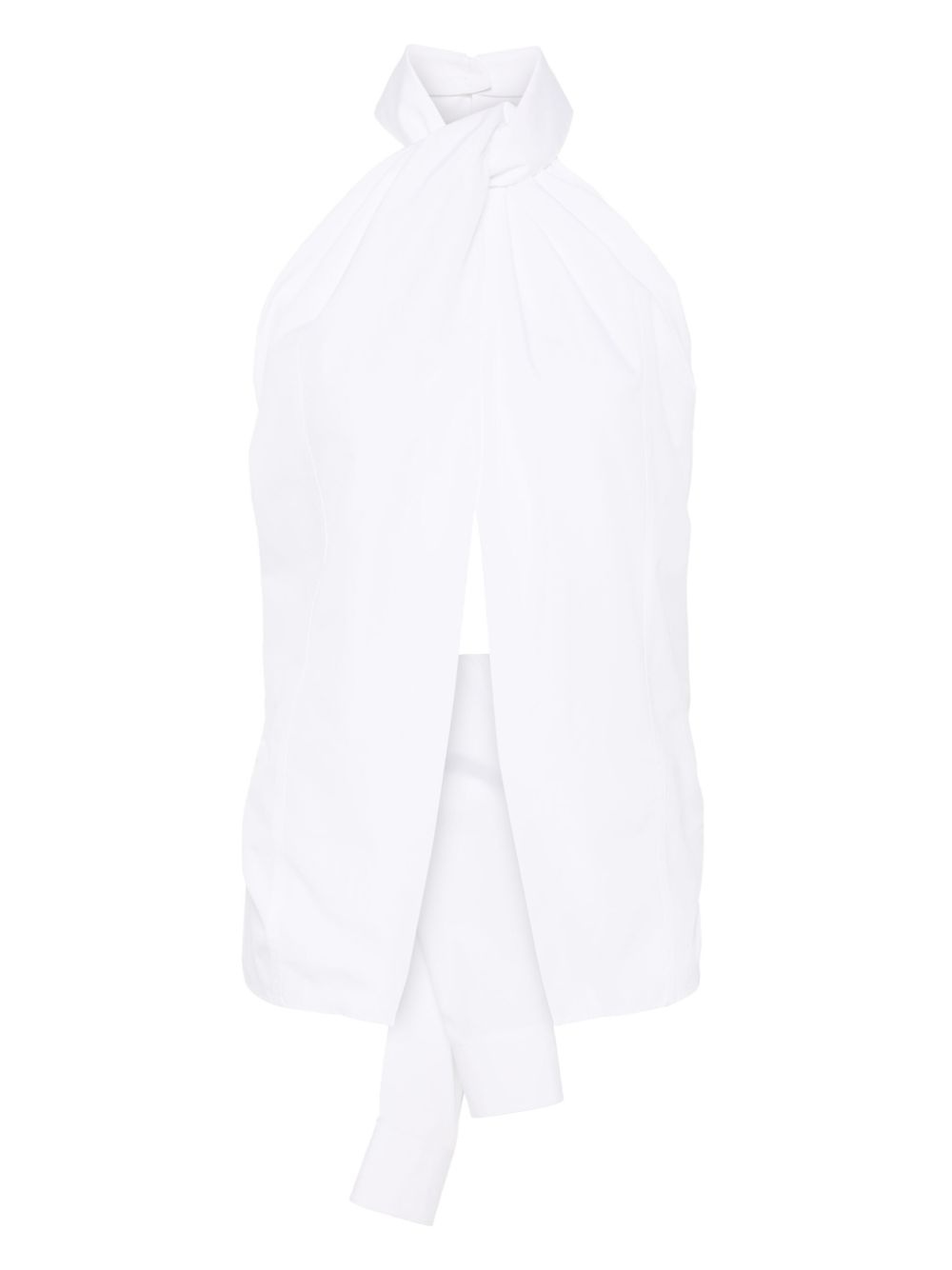 halterneck sleeveless top Highlights - White - Single rear button fastening - Rear tie fastening - Ruched detailing - Asymmetric hem Imported Composition Cotton 100% SIZE & FIT Model measurements Height 5 ft 11 in(1.8 m) Bust/Chest 31.49 in(80 cm) Hips 35.82 in(91 cm) Waist 24.8 in(63 cm) FittingInformation Designed for a slim fit that sits just away from the body offering a close yet comfortable fit Made from a midweight non-stretch fabric Washing instructions Dry Clean Only