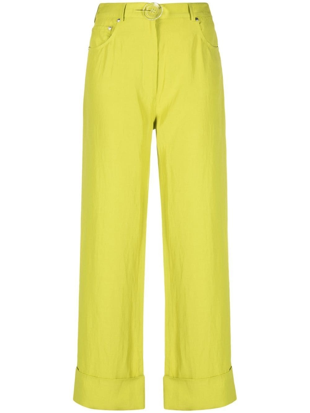 high-waisted straight-leg trousers These tailored trousers stand out in Stella McCartney's SS23 collection, thanks to the vivid chartreuse shade. Made from a sustainable viscose and linen blend, this style is embellished with bold details, such as the oversized front button fastening and contrast brown S-Wave logo patch at the back. Highlights - Lime green - Sustainable viscose-linen blend - Chambray - High waist - Button fly fastening - Classic five pockets - Turn-up cuffs - Logo patch to the rear - Straight leg Imported Composition Viscose 72%, Linen/Flax 28% SIZE & FIT Model measurements Height 5 ft 10 in(1.77 m) Bust/Chest 32.67 in(83 cm) Hips 35.43 in(90 cm) Waist 23.62 in(60 cm) FittingInformation This piece fits true to size. We recommend you get your regular size Designed to be fitted at the waist and hips, loose over the leg Made with a mid-weight non-stretch fabric Washing instructions Dry Clean Only