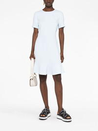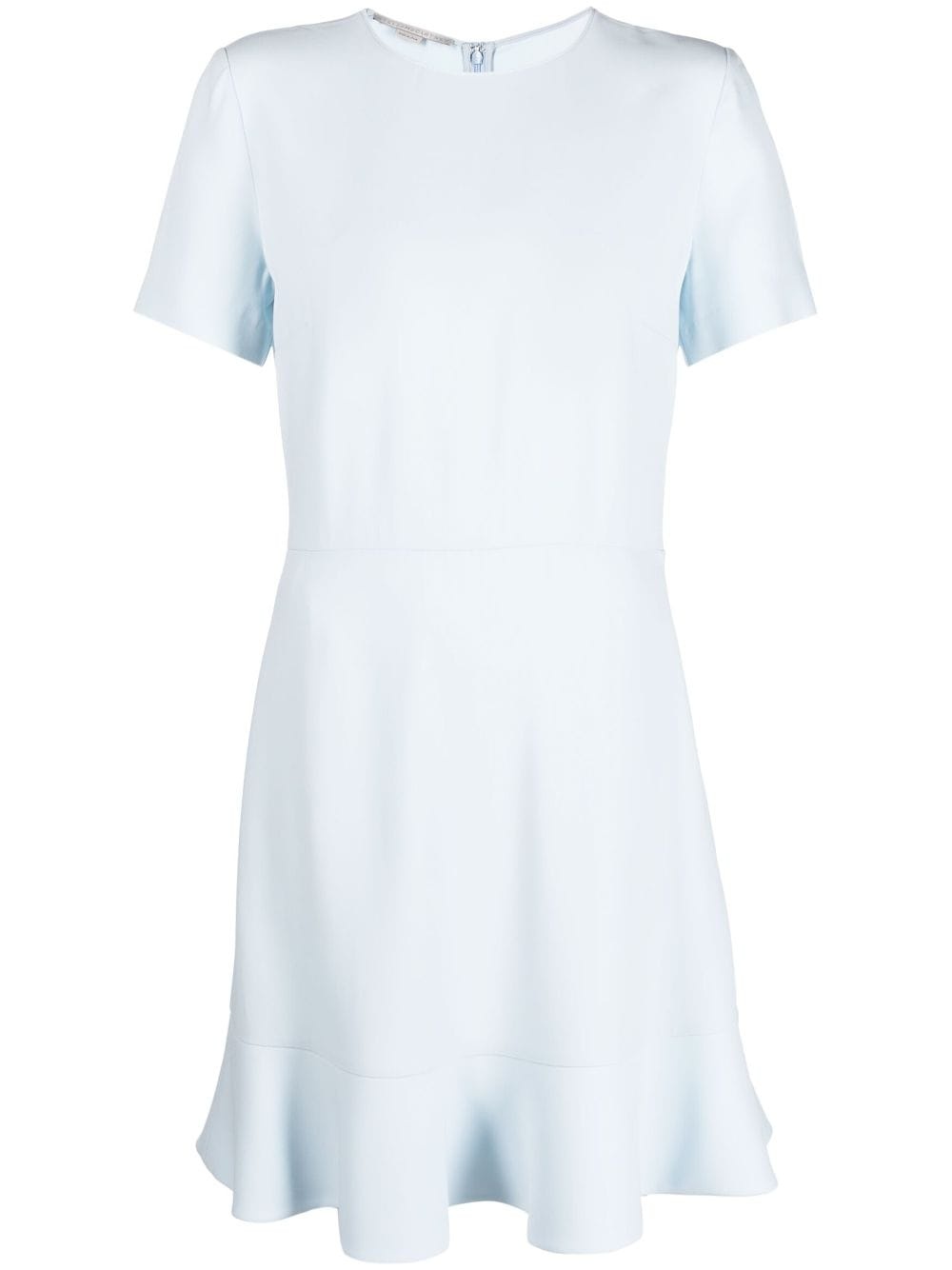 Iconics stretch-cady minidress Stella McCartney's minidress is made from the brand's signature stretch cady. An ode to simplicity, this ice-blue iteration has a classic fit-and-flare silhouette and is free from decoration. Highlights - Ice blue - Cady texture - Round neck - Short sleeves - Peplum hem - Concealed rear zip fastening Made in Italy Composition FSC Viscose 66%, Acetate 30%, Elastane 4% SIZE & FIT Model measurements Height 5 ft 10 in(1.77 m) Bust/Chest 32.28 in(82 cm) Hips 35.03 in(89 cm) Waist 25.19 in(64 cm) Measurement LENGTH 38.18 in(97 cm) WAIST 31.49 in(80 cm) SLEEVE LENGTH 9.05 in(23 cm) HIPS 37.79 in(96 cm) FittingInformation Designed for a slim fit that sits just away from the body offering a close yet comfortable fit The dart stitching adds structure and a closer fit in the torso of this piece Made from a midweight stretch fabric, this piece offers elasticity and flexibility when worn This piece fits true to size – take your usual size