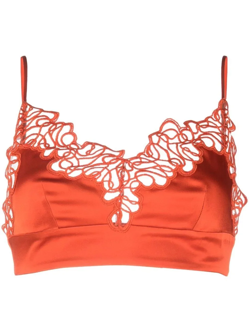 lace-trim triangle bra top Stella McCartney epitomises distinctive elegance with this scarlet-hued bra top. The design's satin finish and decorative lace trim create a contemporary, stand-out aesthetic. Highlights - Scarlet red - Satin finish - Lace trim - Triangle cup - Adjustable spaghetti straps - Rear hook and eye fastening Made in Italy Composition Cotton 82%, Acetate 64%, Viscose 36%, Polyester 11%, Polyamide 7% SIZE & FIT Model measurements Height 5 ft 11 in(1.8 m) Bust/Chest 32.67 in(83 cm) Hips 36.22 in(92 cm) Waist 24.4 in(62 cm) FittingInformation This piece fits true to size. We recommend you get your regular size Cut for a slim fit Made with a mid-weight non-stretch fabric Washing instructions Dry Clean Only