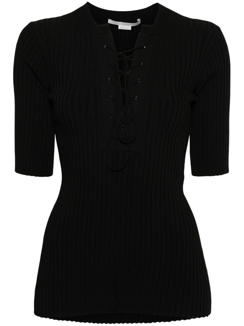 lace-up ribbed top Highlights - Black - Ribbed knit - Ribbed crew neck - Short sleeves - Straight hem - Front short lace-up fastening Made in Italy Composition Polyester 100% SIZE & FIT Model measurements Height 5 ft 11 in(1.8 m) Bust/Chest 32.67 in(83 cm) Hips 36.22 in(92 cm) Waist 24.4 in(62 cm) FittingInformation Designed for a slim fit that sits just away from the body offering a close yet comfortable fit Made with a midweight knit, this piece offers some stretch This piece fits true to size – take your usual size
