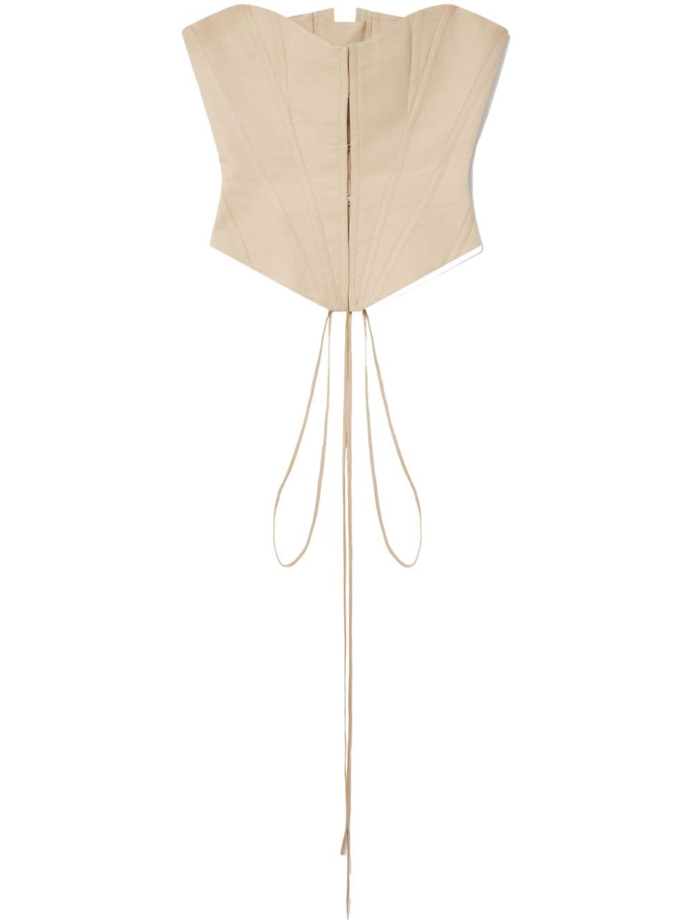 panelled corset-style strapless top Highlights - Light beige - Panelled design - Corset style - Bonded seams - Sweetheart neck - Hook and eye fastening - Rear lace-up fastening - Strapless - Curved hem Made in Italy Composition Viscose 100% Washing instructions Read Manufacturer Guidelines