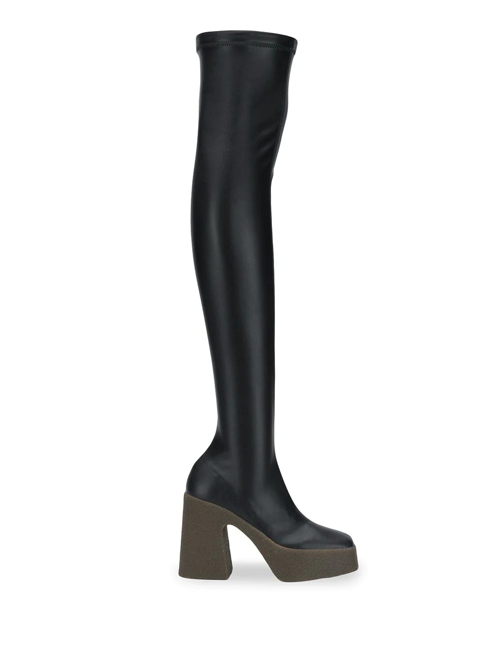 platform thigh-high boots Highlights - Stella mccartney designs for the confident wearer. she makes sustainable sexy again with ethically-sourced and environmentally-friendly fabrics such as these black faux patent leather and rubber, these platform thigh-high boots feature a stretch fit, a platform sole and a side zip fastening. Made in Italy Composition Other fibres 100%