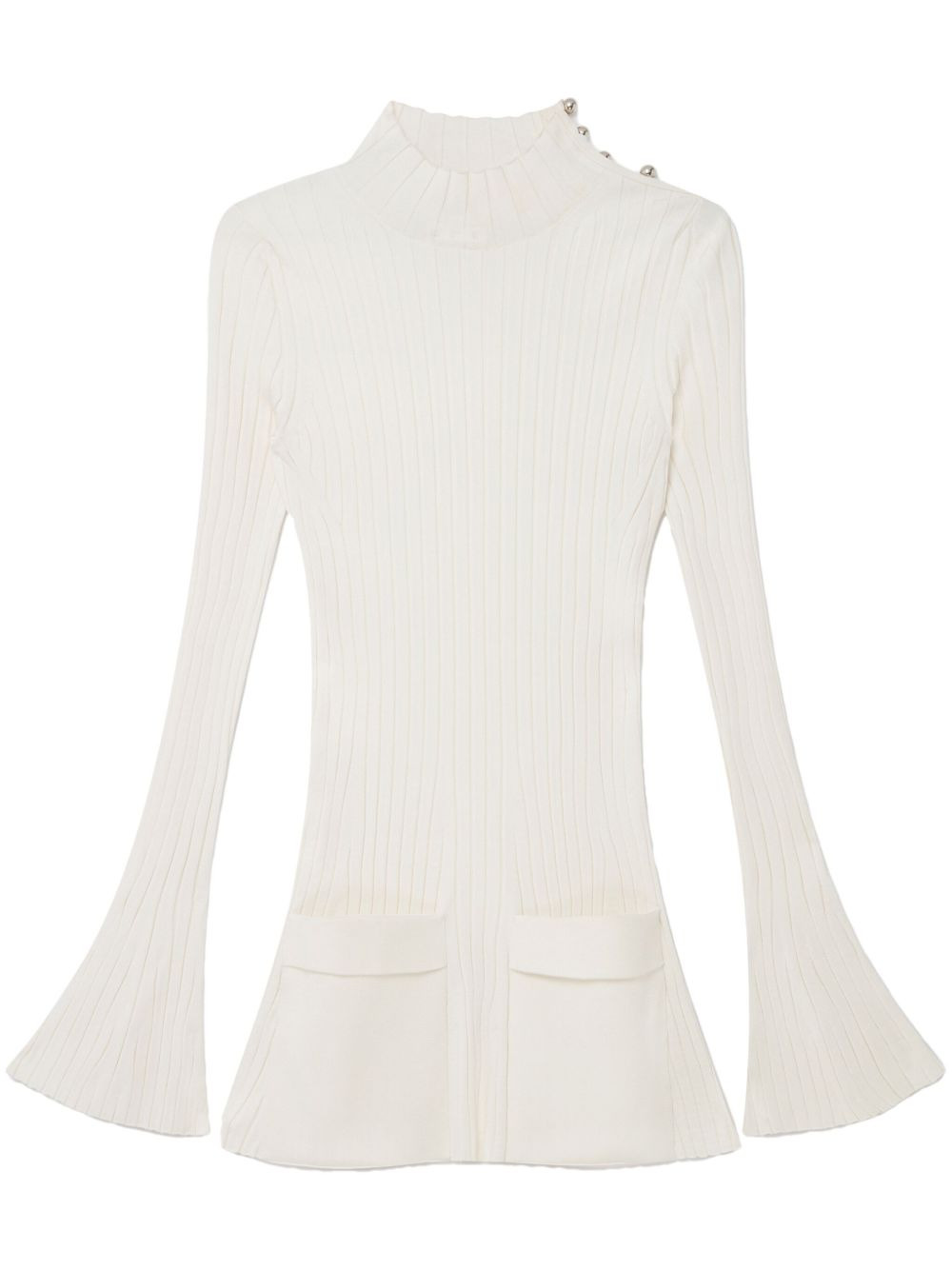 ribbed sweater Highlights - White - Ribbed knit - Button fastening at the shoulder - High neck - Long sleeves - Flared cuffs - Split cuffs - Two front patch pockets - Straight hem - Long length Made in Italy Composition FSC Viscose 87%, Polyester 13% Washing instructions Dry Clean Only