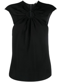 ring-hardware cold-shoulder T-shirt This cold-shoulder design from Stella McCartney benefits from ring hardware detailing at the chest that is paired with a gathered construction to create a V-neck silhouette. Highlights - Black - Sustainable viscose - Ring hardware detailing - V-neck - Cold-shoulder design - Gathered detailing - Straight hem Made in Italy Composition Viscose 96%, Spandex/Elastane 4% SIZE & FIT Model measurements Height 5 ft 10 in(1.78 m) Bust/Chest 31.49 in(80 cm) Hips 35.03 in(89 cm) Waist 23.62 in(60 cm) FittingInformation This piece fits true to size. We recommend you get your regular size Cut for a slim fit Made with a mid-weight stretch fabric Washing instructions Dry Clean Only