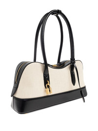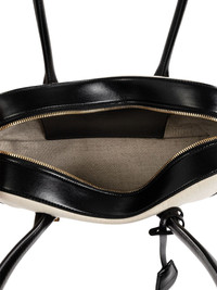 Ryder padlock curved tote bag Highlights - Off-white - Curved top - Black leather trim - Padlock detail - Top handles - Zip fastening Made in Italy Composition Outer: Hemp 100%, Polyurethane 100% SIZE & FIT Measurement DEPTH 3.74 in(9.5 cm) HEIGHT 6.69 in(17 cm) WIDTH 13.77 in(35 cm)