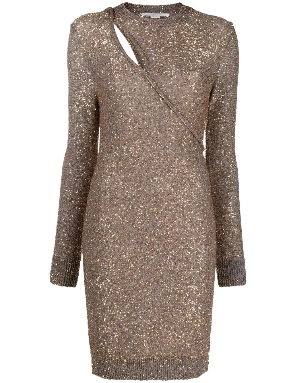 sequin-embellished knitted dress Stella McCartney takes knitwear to a new level with this cut-out mini dress. The long-sleeved design is embellished with tiny gold-tone sequins that reflect the light from every angle. Highlights - Sequin-embellished knitted dress from stella mccartney featuring grey, gold-tone, knitted construction, sequin embellishment, cut-out detailing, crew neck, long sleeves and ribbed trim. . Made in Italy Composition Polyamide 55%, Polyester 45% SIZE & FIT Model measurements Height 5 ft 10 in(1.77 m) Bust/Chest 32.28 in(82 cm) Hips 35.03 in(89 cm) Waist 25.19 in(64 cm) Measurement HIPS 30.7 in(78 cm) LENGTH 32.67 in(83 cm) WAIST 24.4 in(62 cm) FittingInformation This piece fits true to size. We recommend you get your regular size Cut for a close fit Made with a mid-weight fabric Washing instructions Dry Clean Only