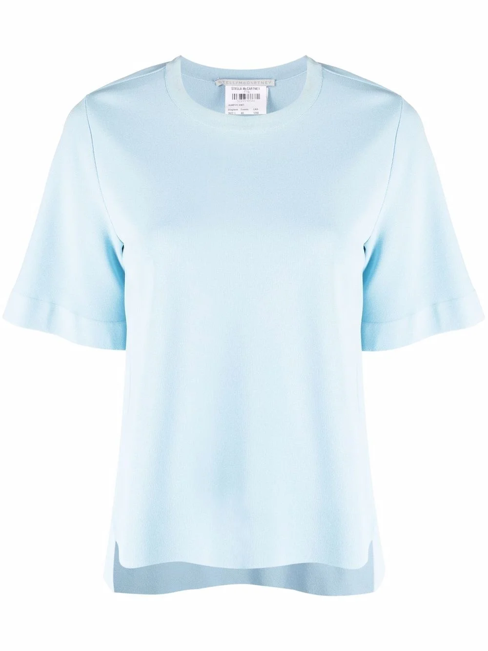 Strong Silhouette short-sleeve T-shirt Stella McCartney takes the humble T-shirt and tweaks it with unexpected details. Notice the slightly flared silhouette and cuffs. Highlights - Light blue - Jersey knit - Crew neck - Short sleeves - High-low hem Made in Italy Composition Viscose 83%, Polyester 17% Washing instructions Dry Clean Only