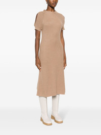 short-sleeve ribbed-knit midi dress Highlights - Light brown - Cashmere blend - Ribbed knit - Knot detailing - Round neck - Short sleeves - Ankle-length - Straight hem Imported Composition Recycled Cashmere 64%, Viscose 33%, Wool 3% SIZE & FIT Model measurements Height 5 ft 10 in(1.77 m) Bust/Chest 34.64 in(88 cm) Hips 35.43 in(90 cm) Waist 24.8 in(63 cm) FittingInformation Designed for a slim fit that sits just away from the body offering a close yet comfortable fit Made with a midweight knit, this piece offers some stretch This piece fits true to size – take your usual size