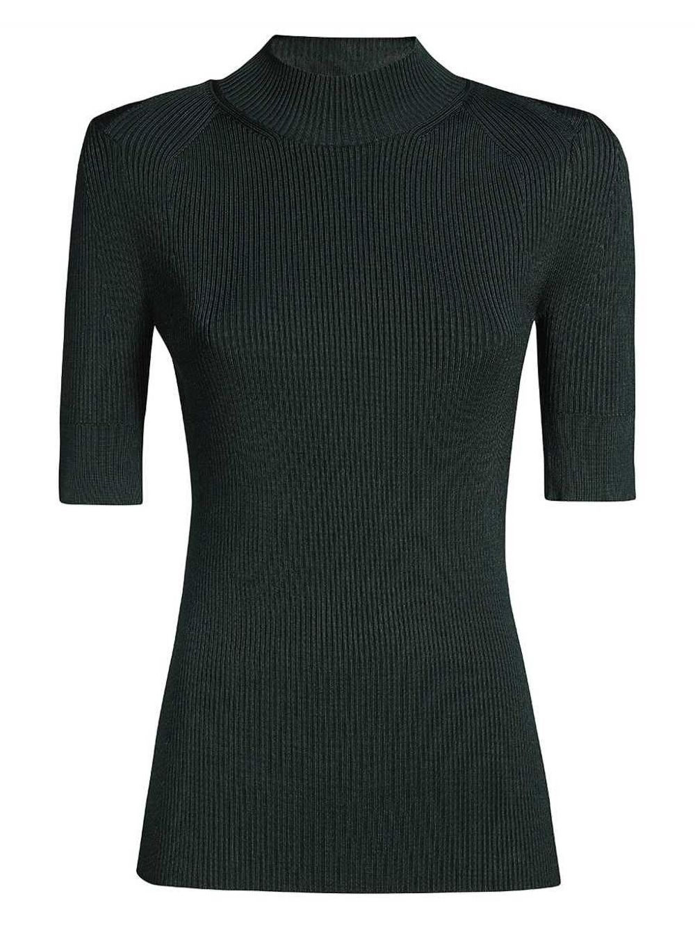 stretch knitted top Highlights - Green - Mock neck - Short sleeves - Straight hem Imported Composition Viscose 79%, Polyamide 19%, Elastane 2%