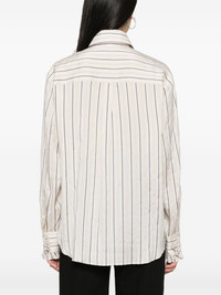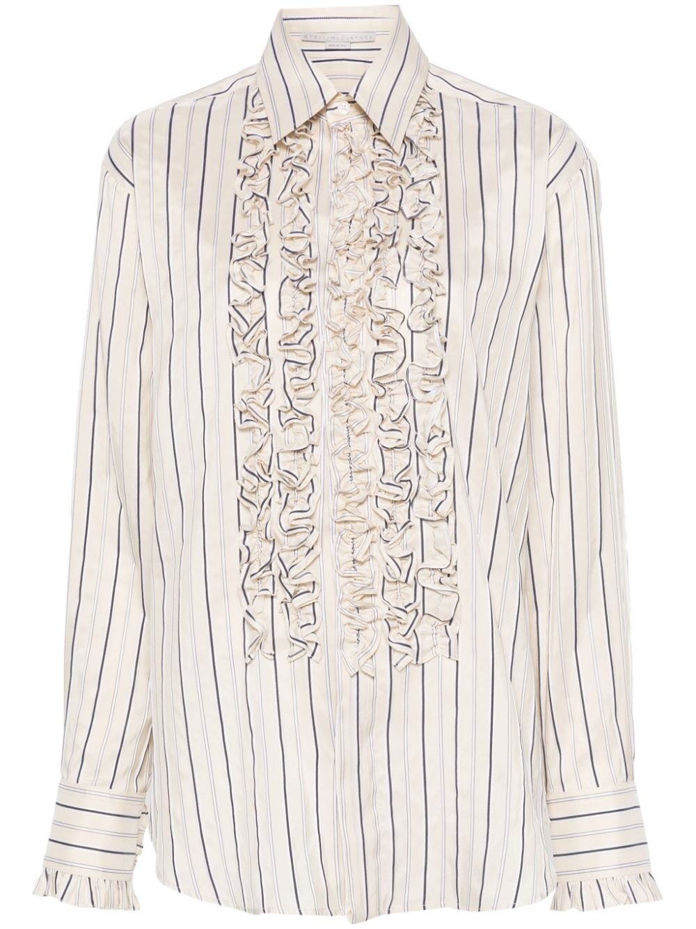 striped ruffled shirt Highlights - Light beige/black/white - Textured finish - Vertical stripe print - Classic collar - Long sleeves - Buttoned cuffs - Ruffled detailing - Box-pleat detail - Curved hem - Concealed front button fastening Made in Italy Composition Silk 76%, Polyester 24% SIZE & FIT Model measurements Height 5 ft 10 in(1.77 m) Bust/Chest 31.49 in(80 cm) Hips 35.82 in(91 cm) Waist 25.98 in(66 cm) FittingInformation Designed to be unstructured, offering a loose fit throughout Made from a lightweight non-stretch fabric This piece fits true to size – take your usual size