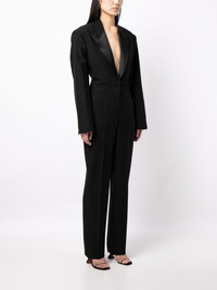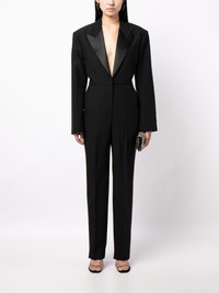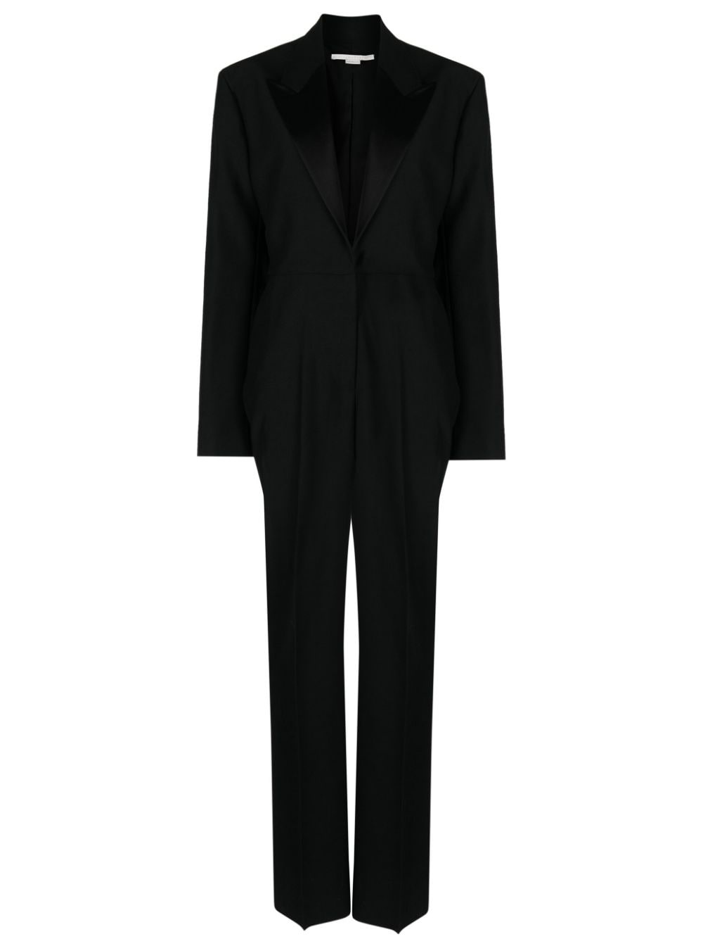 tailored wool jumpsuit Borrowing from classic tuxedo dressing, this Stella McCartney jumpsuit is crafted from wool with sharp peak lapels made from lustrous satin. The plunging V-neck leads to straight-leg trousers with pressed creases. Highlights - Black - Wool - Silk blend - Peak lapels - Long sleeves - Buttoned cuffs - Two side slit pockets Made in Italy Composition Viscose 72%, Silk 28% Body: Wool 100% SIZE & FIT Model measurements Height 5 ft 10 in(1.77 m) Bust/Chest 28.74 in(73 cm) Hips 35.82 in(91 cm) Waist 24.4 in(62 cm) FittingInformation Designed for a loose fit at the chest and waist with a close fit on the hips Made from a midweight non-stretch fabric This piece fits true to size – take your usual size Measurement SLEEVE LENGTH 18.11 in(46 cm) HIPS 35.43 in(90 cm) LENGTH 16.33 in(41.5 cm) WAIST 27.55 in(70 cm) BUST 31.49 in(80 cm) Washing instructions Dry Clean Only