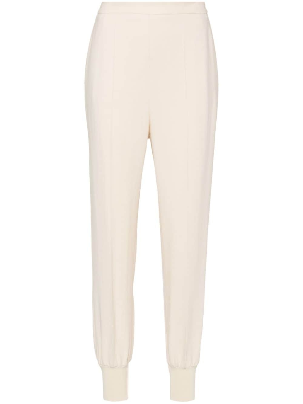 elasticated slim-cut track pants Highlights - Light beige - Stretch-design - Crepe texture - Two side slash pockets - Pressed crease - Ribbed ankles - Tapered leg - Rear elasticated waistband Imported Composition Viscose 96%, Spandex/Elastane 4% SIZE & FIT Model measurements Height 5 ft 9 in(1.76 m) Bust/Chest 31.88 in(81 cm) Hips 35.43 in(90 cm) Waist 24.8 in(63 cm) Measurement FRONT RISE 12.59 in(32 cm) INSIDE LEG 27.55 in(70 cm) HIPS 37 in(94 cm) WAIST 27.55 in(70 cm) FittingInformation Designed for a tapered fit, these trousers allow for a close fit at the waist and a loose unrestricted fit over the leg with a closer fit towards the ankle The partially elasticated waistband offers increased movement and comfort at the waist Made from a midweight stretch fabric, this piece offers elasticity and flexibility when worn This piece fits true to size – take your usual size Washing instructions Dry Clean Only