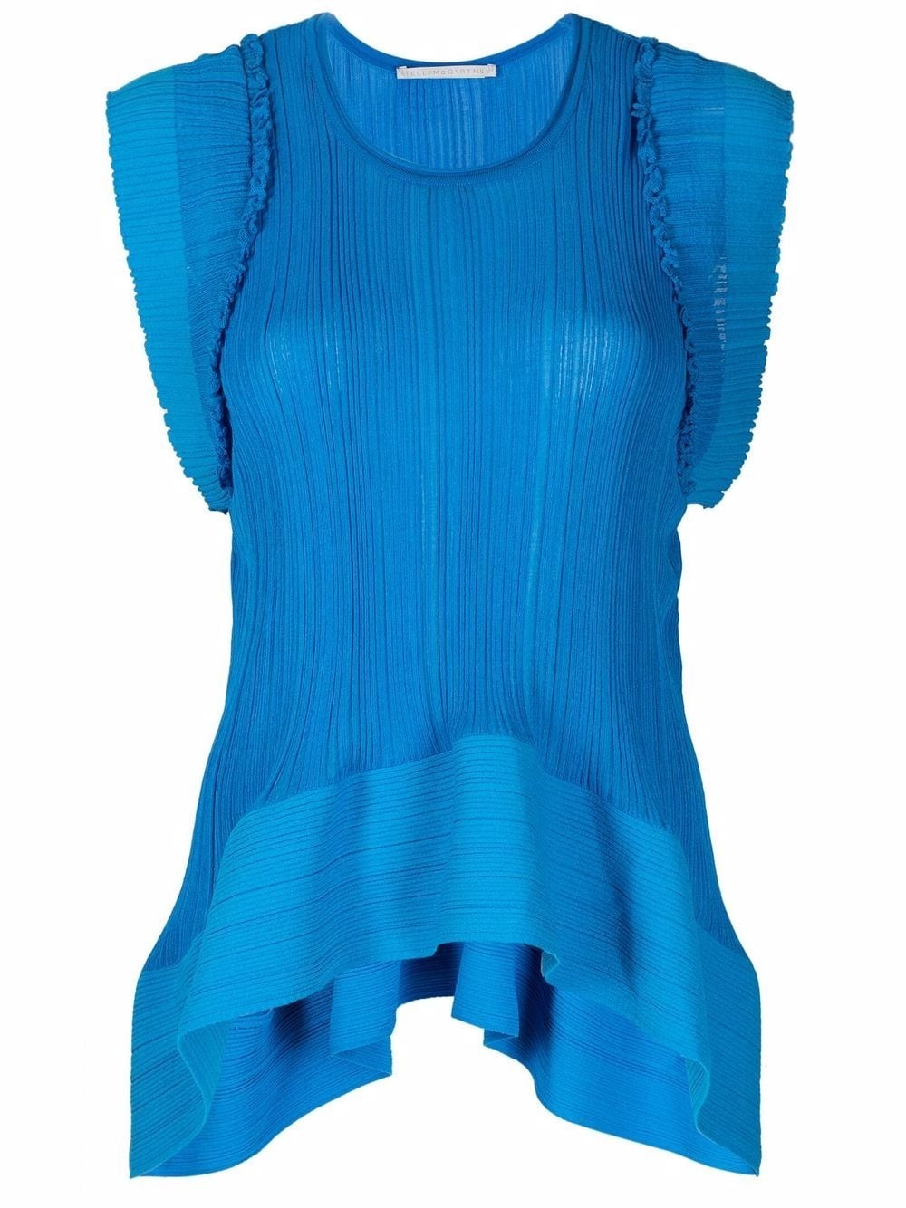 two-tone fine-ribbed top With a fine-ribbed construction in shades of blue, this top from Stella McCartney is detailed with an asymmetric hem. Highlights - Blue - Two-tone design - Fine ribbed - Round neck - Cap sleeves - Asymmetric hem Made in Italy Composition Viscose 82%, Polyamide 12%, Polyester 6% SIZE & FIT Model measurements Height 5 ft 9 in(1.74 m) Bust/Chest 32.28 in(82 cm) Hips 35.82 in(91 cm) Waist 24.01 in(61 cm) FittingInformation This piece fits true to size. We recommend you get your regular size Cut for a loose fit Made with a mid-weight fabric Washing instructions Dry Clean Only