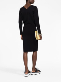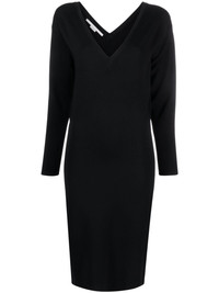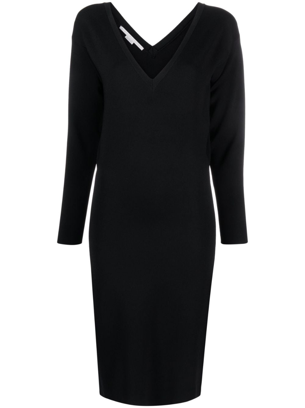 V-neck knitted midi dress Woven in Italy to a lightweight knit construction, Stella McCartney’s black midi dress showcases the brand’s propensity for classic silhouettes. It’s cut to a knee length with a V-neck and V-back. Highlights - Black - Knitted construction - V-neck - Long sleeves - V-back - Knee-length - Straight hem Made in Italy Composition Viscose 83%, Polyester 17% SIZE & FIT Model measurements Height 5 ft 10 in(1.77 m) Bust/Chest 32.28 in(82 cm) Hips 35.03 in(89 cm) Waist 25.19 in(64 cm) FittingInformation Designed for a slim fit that sits just away from the body offering a close yet comfortable fit Made with a midweight knit, this piece offers some stretch This piece fits true to size – take your usual size