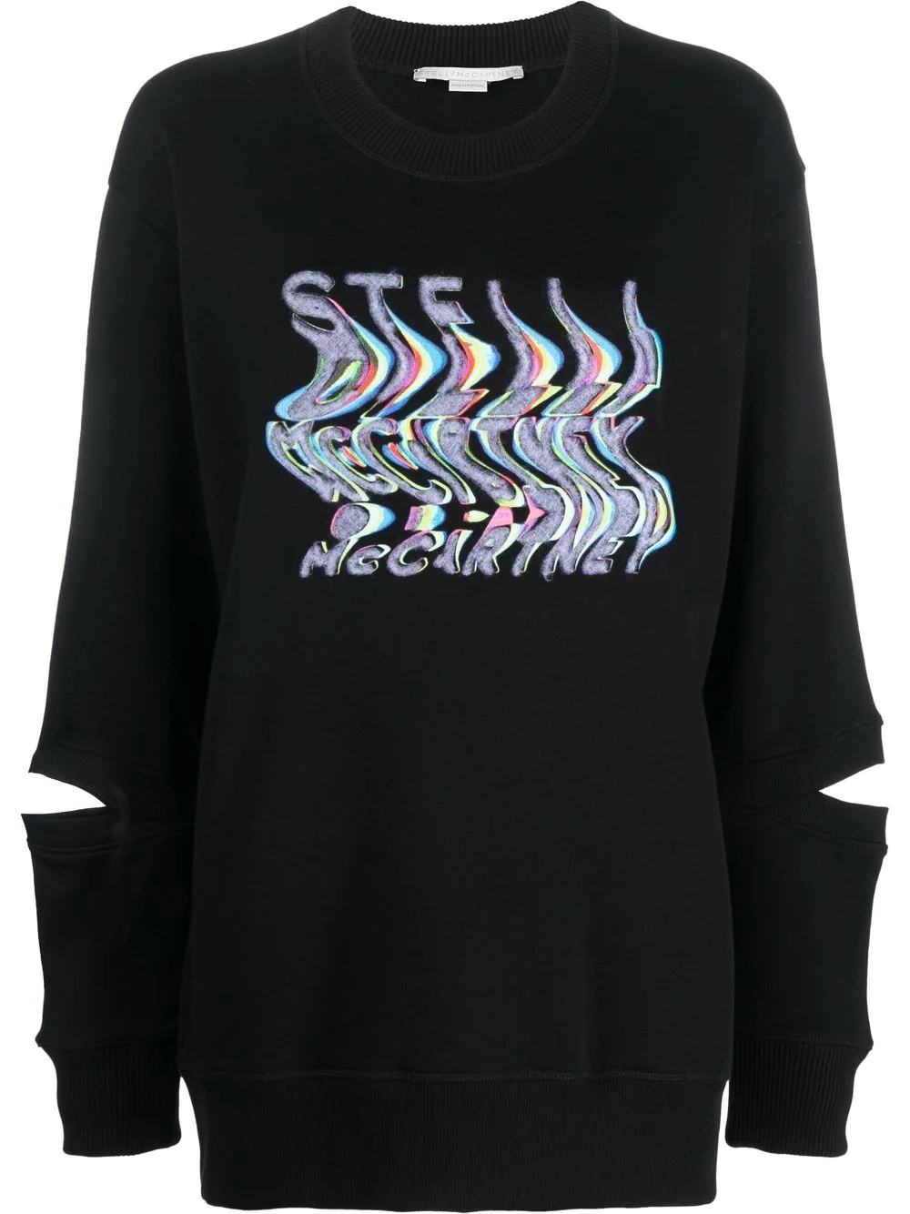 warped-logo oversized sweatshirt Stella McCartney elevates this oversized organic cotton sweatshirt with a contrasting logo print situated at the front. The bold lettering is playfully warped in the middle for a slightly futuristic touch. Highlights - Black - Organic cotton - Logo print to the front - Cut-out details to each sleeve - Crew neck - Drop shoulder - Long sleeves - Ribbed trim - Oversized style Imported Composition Cotton 100% SIZE & FIT Model measurements Height 5 ft 10 in(1.78 m) Bust/Chest 31.49 in(80 cm) Hips 35.43 in(90 cm) Waist 24.4 in(62 cm) FittingInformation This piece fits true to size. We recommend you get your regular size Cut for an oversized fit Made with a mid-weight fabric Washing instructions Machine Wash