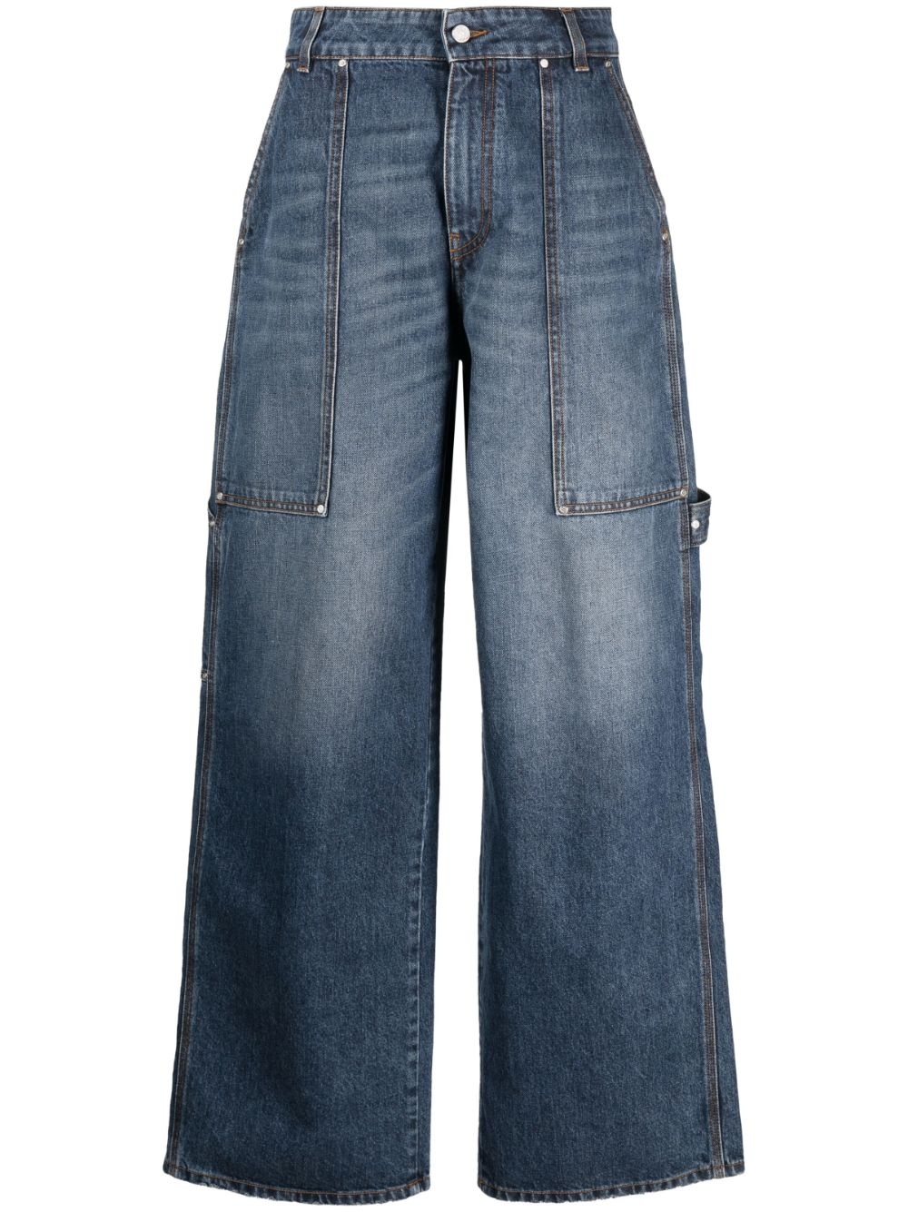 wide-leg jeans Inspired by utility, these jeans from Stella McCartney are fitted with oversized patch front pockets and a hammer loop at one leg. Cut from mid-wash denim that's been artfully faded and whiskered, they're designed to look subtly love-worn. Highlights - Blue - Cotton/denim - Stonewashed - Whiskering effect - Wide leg - Front button and zip fastening - Multiple patch pockets Made in Italy Composition Lining: Polyester 52%, Cotton 48% Outer: Cotton 100% SIZE & FIT Model measurements Height 5 ft 10 in(1.79 m) Bust/Chest 31.49 in(80 cm) Hips 35.03 in(89 cm) Waist 23.62 in(60 cm) Measurement FRONT RISE 12.4 in(31.5 cm) INSIDE LEG 33.07 in(84 cm) HIPS 39.37 in(100 cm) FittingInformation Designed with a wide leg cut, these jeans allow for a close fit at the waist and offer a loose and roomy fit over the leg Sturdy and hard-wearing, this denim piece offers no stretch This piece fits true to size – take your usual size Washing instructions Machine Wash