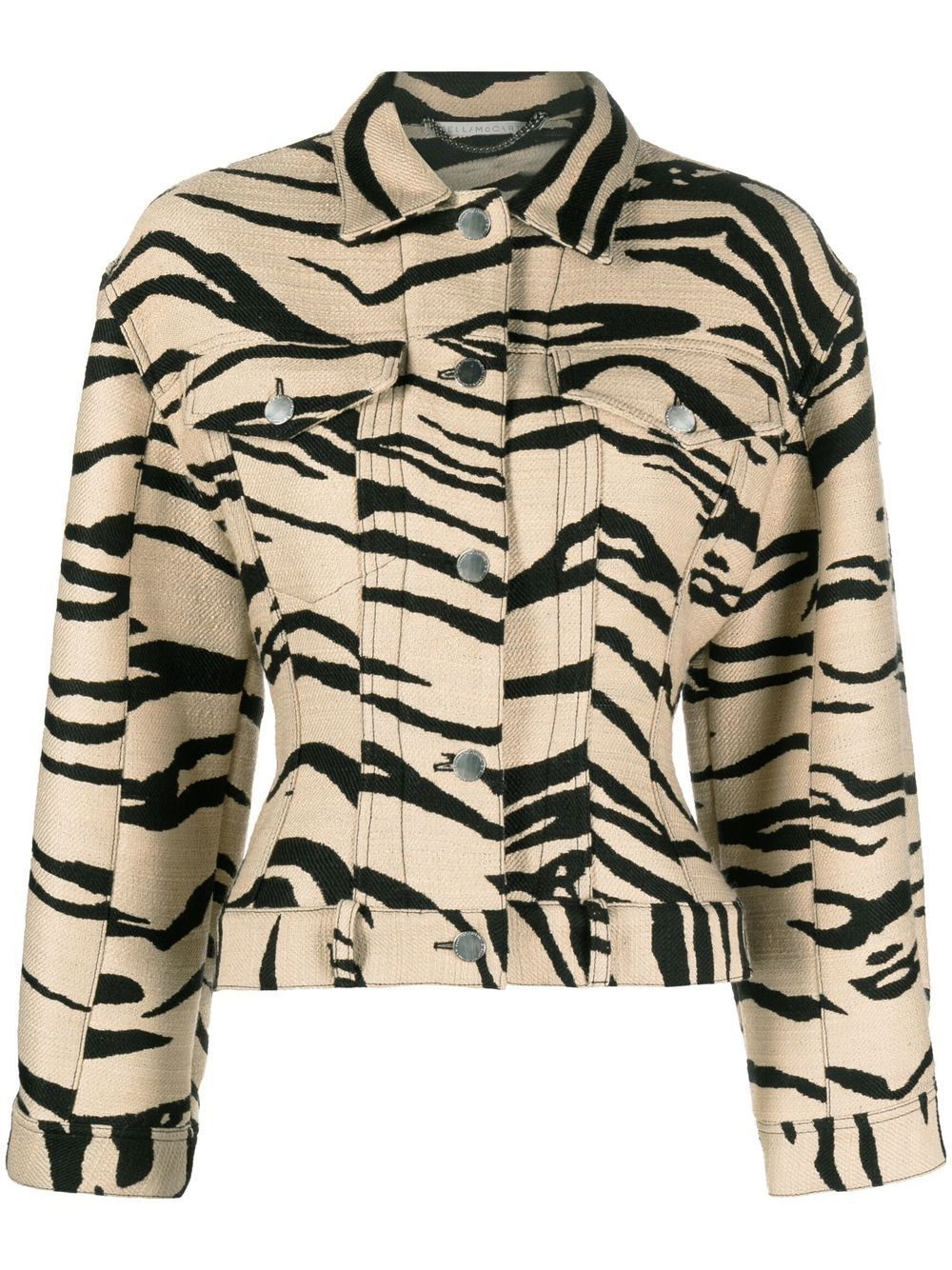 zebra-print trucker jacket This Stella McCartney jacket is patterned with a zebra print in black and beige for a modern and versatile take on the classic print. A slight cinch at the waist makes the trucker silhouette more elegant. Highlights - Beige/black - Zebra print - Classic collar - Front button fastening - Chest flap pockets - Fitted waistline - Long sleeves - Straight hem Made in Italy Composition Polyester 100% SIZE & FIT Model measurements Height 5 ft 10 in(1.78 m) Bust/Chest 31.49 in(80 cm) Hips 35.03 in(89 cm) Waist 23.62 in(60 cm) Washing instructions Dry Clean Only