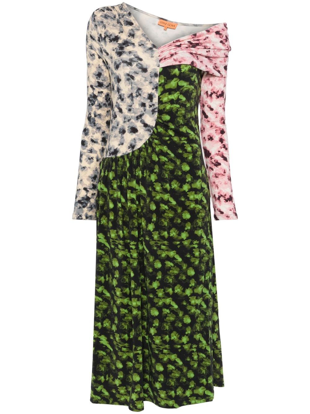 one-shoulder long-sleeves midi dress Highlights - Green - Concealed side zip fastening - Gathered detailing - Patchwork design - Floral print Imported Composition Lyocell 96%, Spandex/Elastane 4% SIZE & FIT Model measurements Height 5 ft 10 in(1.78 m) Bust/Chest 33.85 in(86 cm) Hips 36.61 in(93 cm) Waist 26.77 in(68 cm) FittingInformation Designed for a close fit at the chest and waist with a loose fit at the hip Made from a midweight stretch fabric, this piece offers elasticity and flexibility when worn
