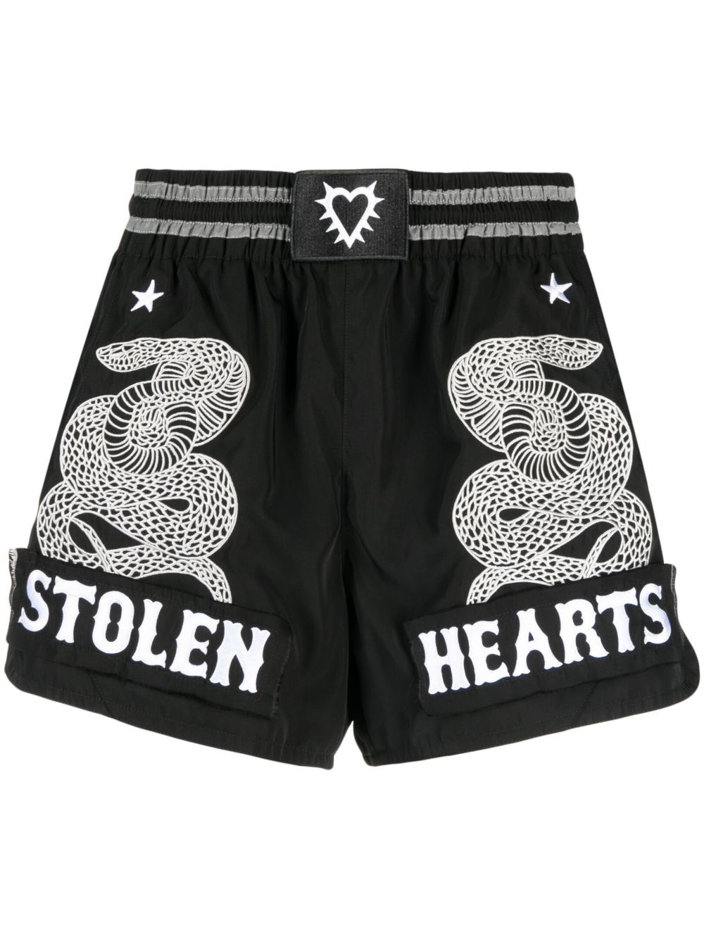 Snake Charmer shorts black logo patch to the front embroidered motif elasticated waistband two side inset pockets rear patch pocket Imported Composition Body: Polyester 100% SIZE & FIT Model measurements Height 6 ft 2 in(1.87 m) Bust/Chest 34.25 in(87 cm) Hips 36.22 in(92 cm) Waist 29.52 in(75 cm) FittingInformation This piece fits true to size. We recommend you get your regular size Designed for a slim fit at the waist and loose over the leg Made with a mid-weight non-stretch fabric
