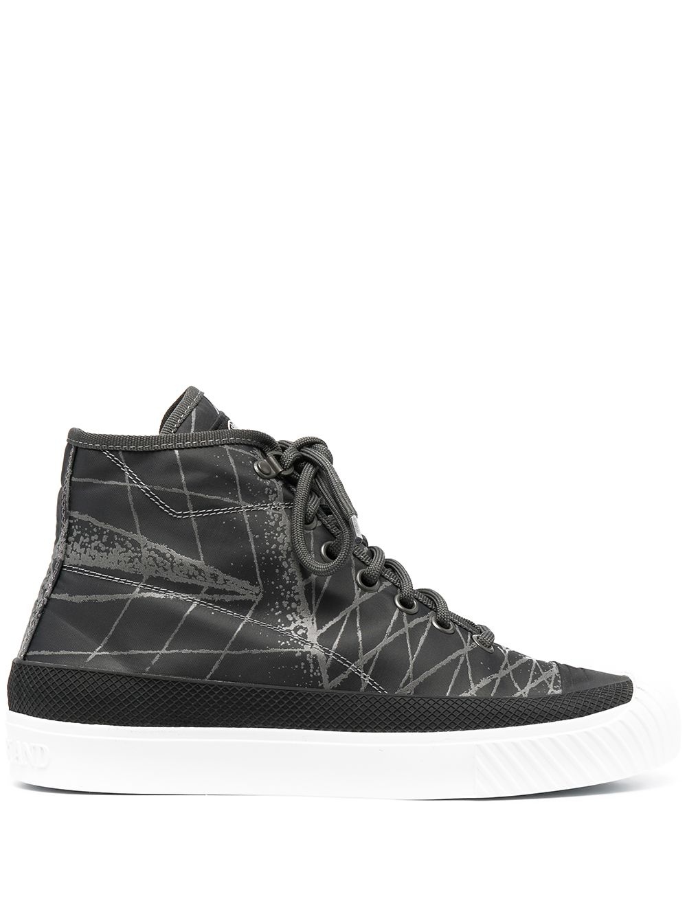abstract-print high-top sneakers grey abstract pattern print logo patch at the tongue contrasting toecap round toe front lace-up fastening ankle-length flat rubber sole Made in Italy Composition Outer: Fabric 100% Sole: Rubber 100% Lining: Calf Leather 100% SIZE & FIT Measurement HEEL 0.98 in(2.5 cm) HEIGHT 5.11 in(13 cm) Sole height 0.78 in(2 cm)