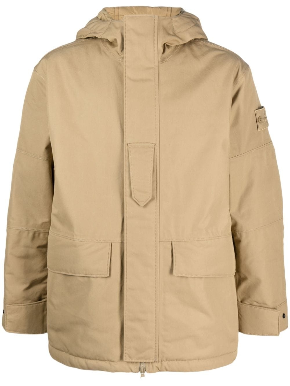 garment-dyed cotton hooded jacket Reflective of Stone Island's inquisitive approach to garments, the Compass motif is found at the sleeve of this beige hooded jacket – crafted from garment-dyed cotton and fitted with a pull-tab at the front. Highlights - Beige - Cotton - Garment dyed - Classic hood - Concealed front fastening - Two front flap pockets - Long sleeves - Buttoned cuffs - Signature compass motif - Straight hem Made in Italy Composition Outer: Cotton 100% Lining: Polyester 100%, Polyamide 100% SIZE & FIT Model measurements Height 6 ft 2 in(1.88 m) Bust/Chest 36.61 in(93 cm) Hips 35.82 in(91 cm) Waist 27.95 in(71 cm) FittingInformation Designed to be unstructured, offering a loose fit throughout The internal drawstring at the hem allows for fitted preferences Made from a padded non-stretch fabric, giving it no natural elasticity This piece fits true to size – take your usual size Washing instructions Hand Wash