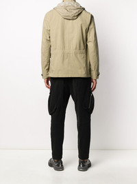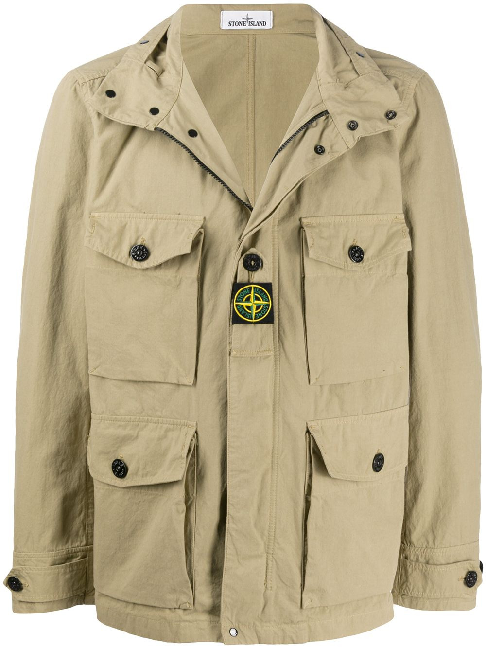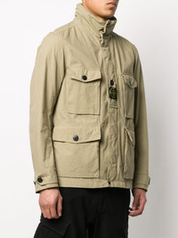 logo utility jacket Beige logo utility jacket from Stone Island featuring a high standing collar, a front fastening, two chest patch pockets, side pockets, a front logo patch, long sleeves and a straight hem. Imported Composition Cotton 70%, Polyamide 30% SIZE & FIT Model measurements Height 6 ft 2 in(1.89 m) Bust/Chest 36.22 in(92 cm) Hips 37.79 in(96 cm) Waist 29.52 in(75 cm) FittingInformation This piece fits true to size. We recommend you get your regular size Cut for a loose fit Made with a mid-weight non-stretch fabric Washing instructions Machine Wash