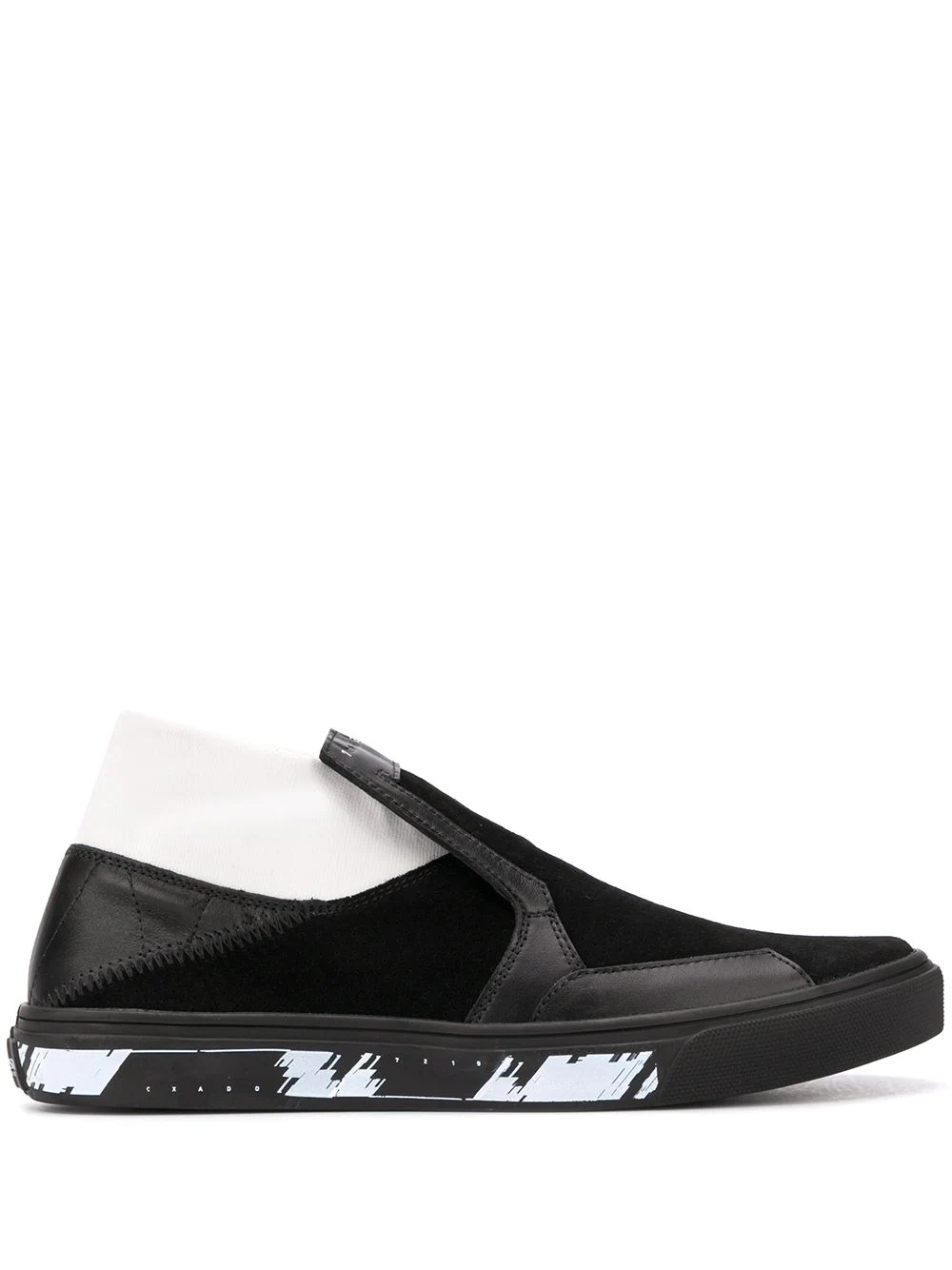 contrast panel perforated sneakers Black and white leather and rubber contrast panel perforated sneakers from Stone Island Shadow Project featuring a textured style, contrasting panels, eyelets, a print to the side, a flat heel, a round toe and a concealed fastening. Made in Italy Composition Outer: Calf Leather 100%, Fabric 100% Lining: Calf Leather 100%, Fabric 100% Sole: Rubber 100% SIZE & FIT Measurement HEEL 0.98 in(2.5 cm) HEIGHT 4.33 in(11 cm) Sole height 0.98 in(2.5 cm)