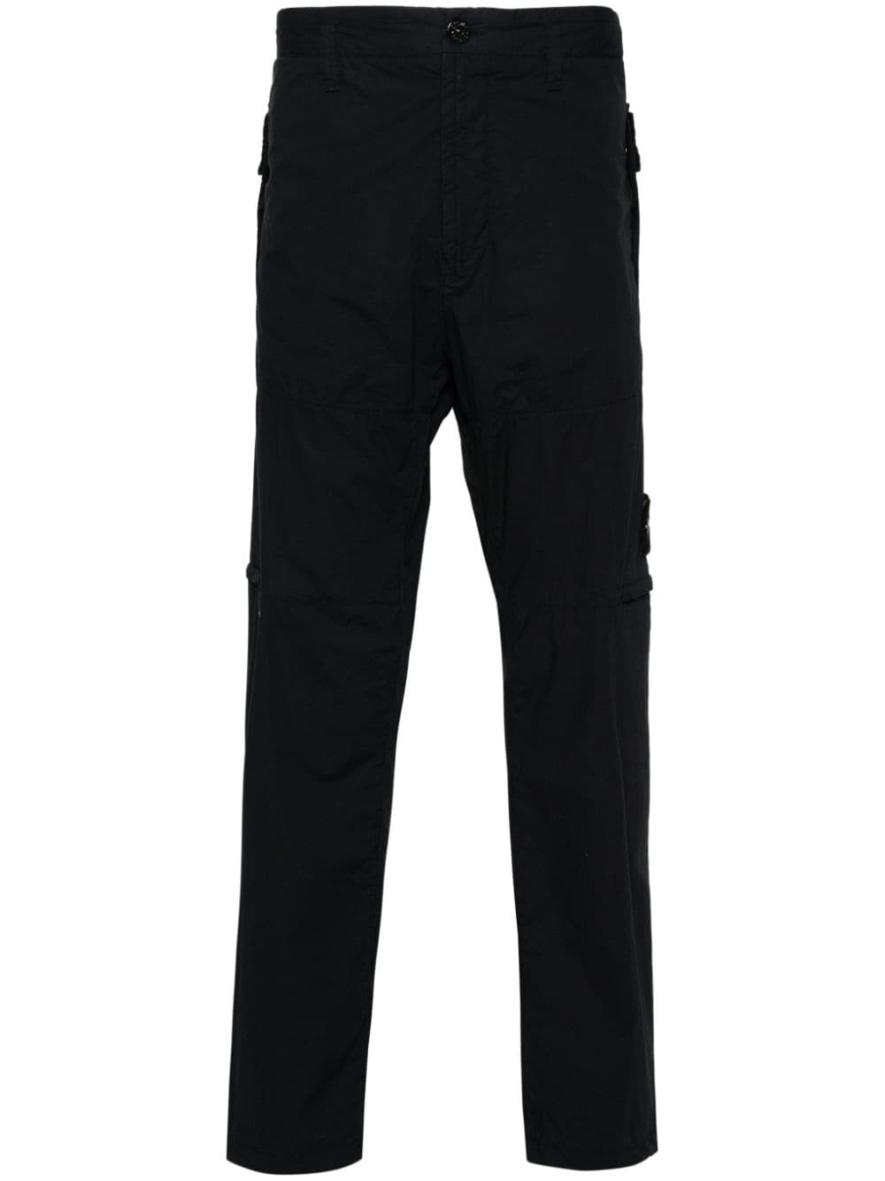 straight-leg cargo trousers These navy Stone Island trousers are rooted the brand’s exploration of fabric research and treatment. They’re cut to a straight-leg profile from gabardine that’s garment dyed for even pigmentation and kitted with zip cargo pockets to reinforce their functionality. Highlights - Navy blue - Stretch-cotton - Gabardine weave - Garment dyed - Mid-rise - Belt loops - Two side zip-fastening pockets - Signature detachable compass badge - Two rear flap pockets - Drawstring cuffs - Straight leg - Front button and zip fastening Imported Composition Cotton 97%, Elastane 3% SIZE & FIT Model measurements Height 6 ft 2 in(1.87 m) Bust/Chest 37.79 in(96 cm) Hips 37.79 in(96 cm) Waist 30.31 in(77 cm) FittingInformation Designed for a relaxed straight leg, allowing a comfortable and loose fit over the leg Made from a midweight stretch fabric, this piece offers elasticity and flexibility when worn