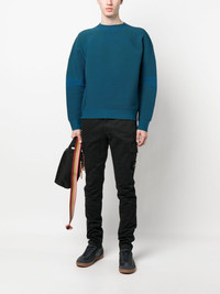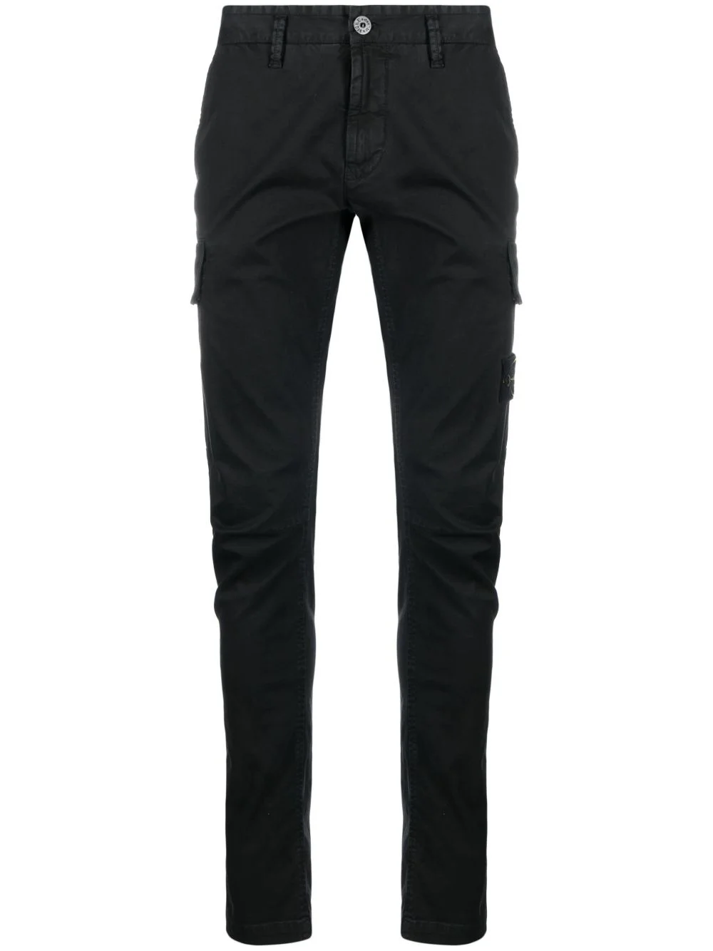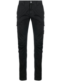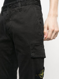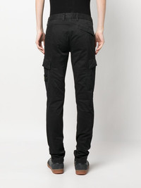 stretch-cotton tapered-leg trousers black stretch-cotton slim cut logo patch to the side tapered leg front button and zip fastening two side slit pockets side cargo pocket rear welt pocket Imported Composition Cotton 98%, Elastane 2% Washing instructions Machine Wash