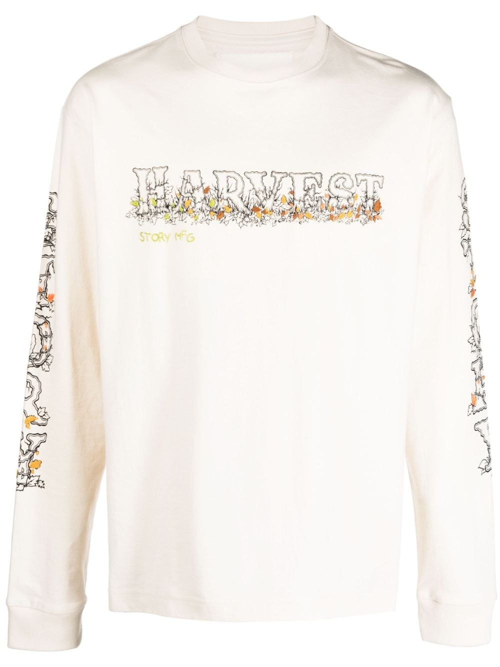 Harvest logo-print sweatshirt This Harvest long-sleeve T-shirt from Story mfg. is crafted from organic cotton cut to a relaxed silhouette. It's finished with intricate leave detailing on the chest and sleeves, complementing the bold logo lettering. Highlights - Off-white/multicolour - Organic cotton - Floral print - Logo print to the front - Logo print at the sleeve - Long sleeves - Ribbed cuffs and hem - Straight hem Imported Composition Organic Cotton 100% SIZE & FIT Model measurements Height 6 ft 2 in(1.88 m) Bust/Chest 37.79 in(96 cm) Hips 35.82 in(91 cm) Waist 29.92 in(76 cm) Measurement CHEST 41.73 in(106 cm) SLEEVE LENGTH 34.64 in(88 cm) Shoulder Width 19.29 in(49 cm)