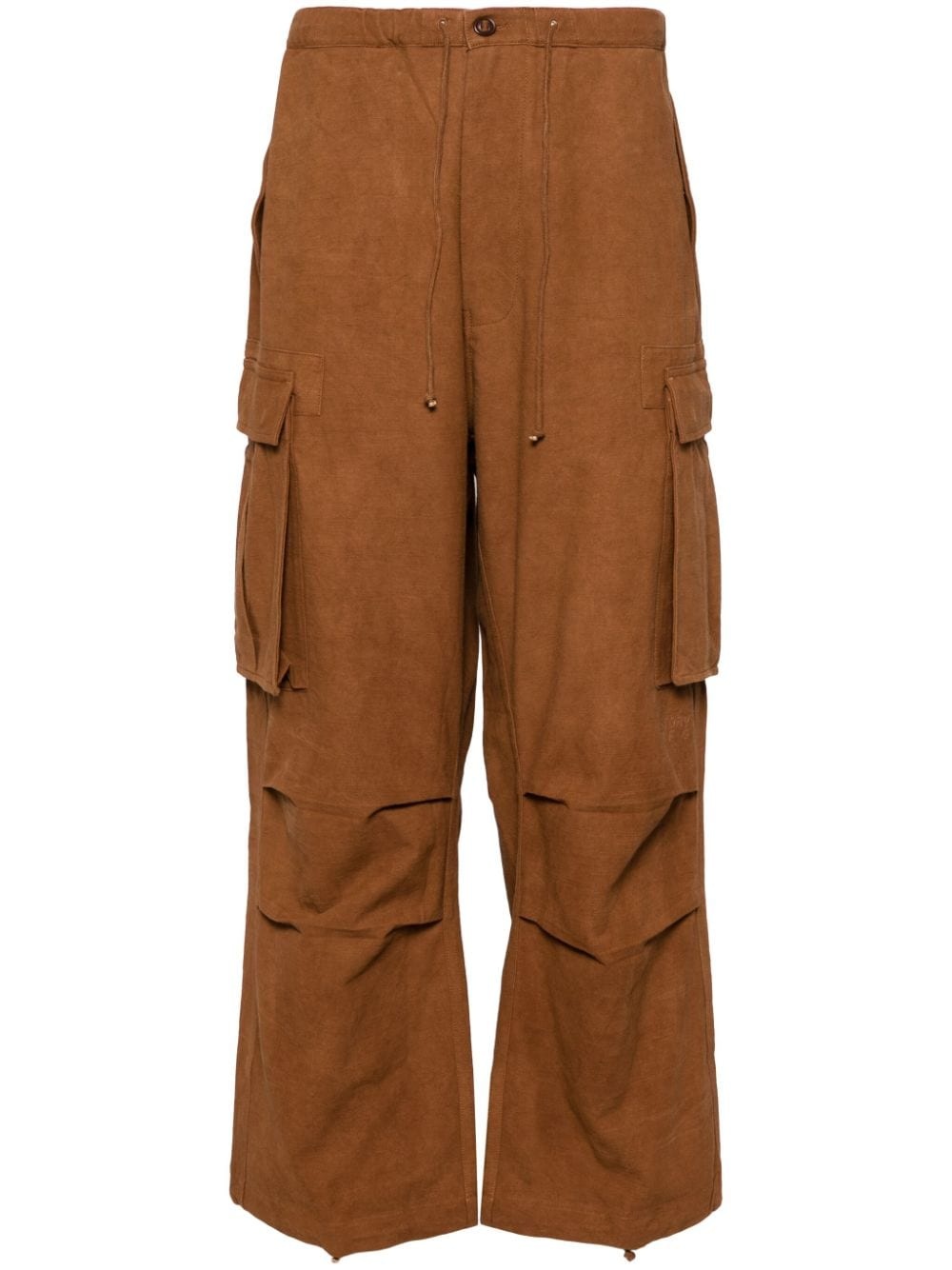 organic cotton cargo trousers Highlights - Rust brown - Organic cotton - Drawstring waist - Two side cargo pockets - Front button fastening - Straight leg Imported Composition Organic Cotton 100% SIZE & FIT Model measurements Height 6 ft 2 in(1.87 m) Bust/Chest 34.25 in(87 cm) Hips 36.22 in(92 cm) Waist 29.52 in(75 cm) FittingInformation Designed with a wide leg, offering a loose and roomy fit The internal drawstring at the hem allows for fitted preferences at the ankle Made from a midweight non-stretch fabric This piece fits true to size – take your usual size