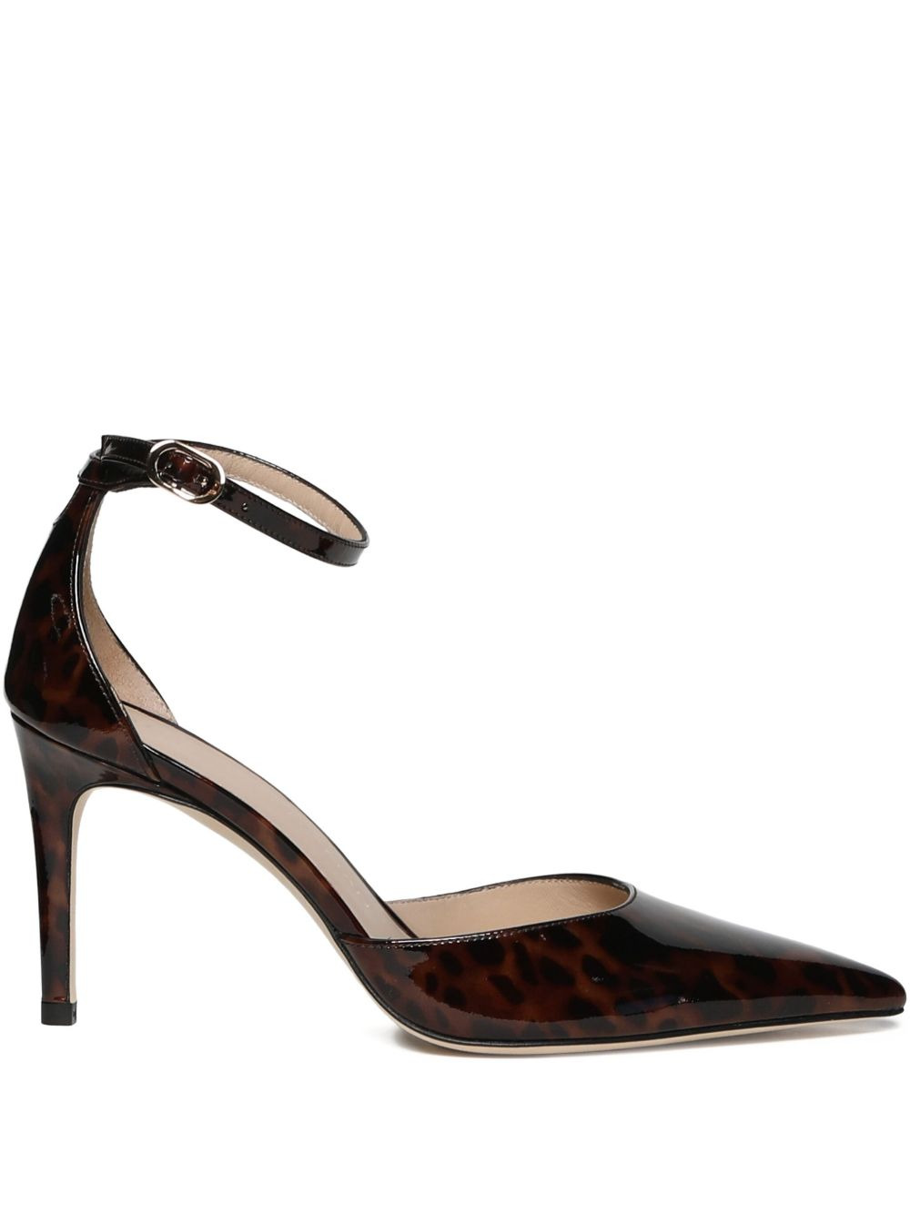 85mm ankle strap pointed pumps Highlights - Dark brown - Pointed toe - Ankle strap - Stiletto heel - Buckle fastening - Patent finish Imported Composition Outer: Patent Calf Leather 100% Lining: Calf Leather 100% Sole: Calf Leather 100% SIZE & FIT Measurement HEEL 3.34 in(8.5 cm)