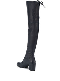 knee length heeled boots Dark blue knee length heeled boots from Stuart Weitzman featuring a tie fastening, a mid high block heel, an almond toe, a brand embossed insole and a slim fit. Imported Composition Outer: Leather 100% Lining: Leather 100%, Polyester 100% Sole: Rubber 100%