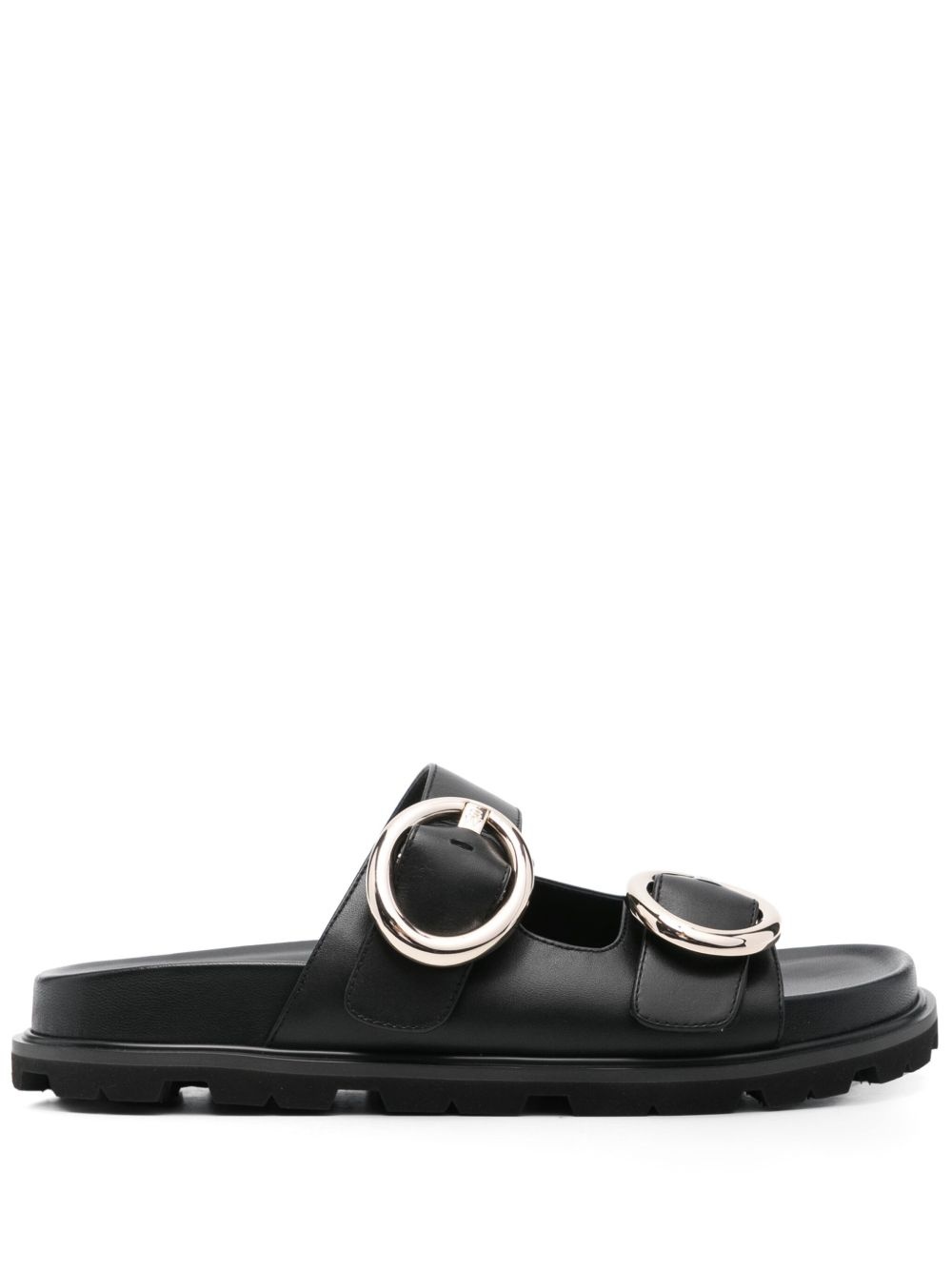 leather sandals Highlights - Black - Slip-on style - Flat rubber sole - Decorative buckle detail - Branded footbed Imported Composition Lining: Calf Leather 100% Outer: Calf Leather 100% Sole: Rubber 100%